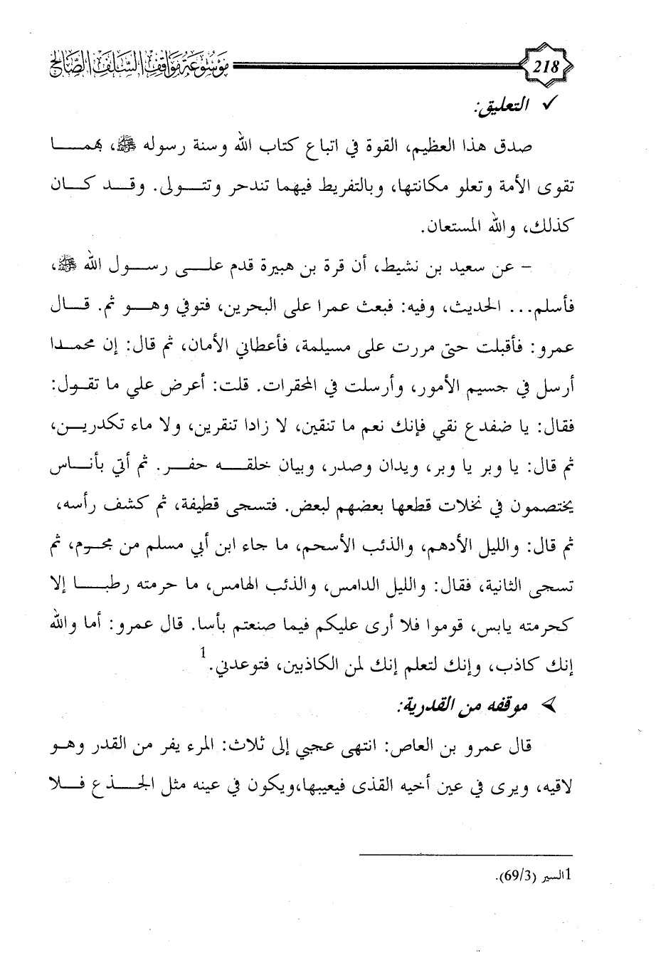 - عن سعيد بن نشيط، أن قرة بن هبيرة قدم على رسول الله - صلى الله عليه وسلم -، فأسلم ... الحديث، وفيه: فبعث عمرا على البحرين، فتوفي وهو ثم. قال عمرو: فأقبلت حتى مررت على مسيلمة، فأعطاني الأمان، ثم قال: إن محمدا أرسل في جسيم الأمور، وأرسلت في المحقرات. قلت: أعرض علي ما تقول: فقال: يا ضفدع نقي فإنك نعم ما تنقين، لا زادا تنقرين، ولا ماء تكدرين، ثم قال: يا وبر يا وبر، ويدان وصدر، وبيان خلقه حفر. ثم أتي بأناس يختصمون في نخلات قطعها بعضهم لبعض. فتسجى قطيفة، ثم كشف رأسه، ثم قال: والليل الأدهم، والذئب الأسحم، ما جاء ابن أبي مسلم من مجرم، ثم تسجى الثانية، فقال: والليل الدامس، والذئب الهامس، ما حرمته رطبا إلا كحرمته يابس، قوموا فلا أرى عليكم فيما صنعتم بأسا. قال عمرو: أما والله إنك كاذب، وإنك لتعلم إنك لمن الكاذبين، فتوعدني. (¬1)
