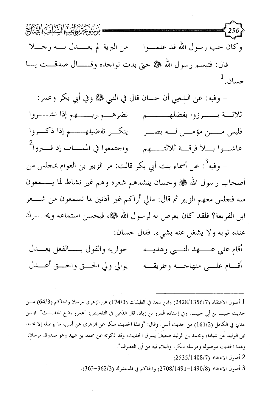 - وفيه: عن الشعبي أن حسان قال في النبي - صلى الله عليه وسلم - وفي أبي بكر وعمر: