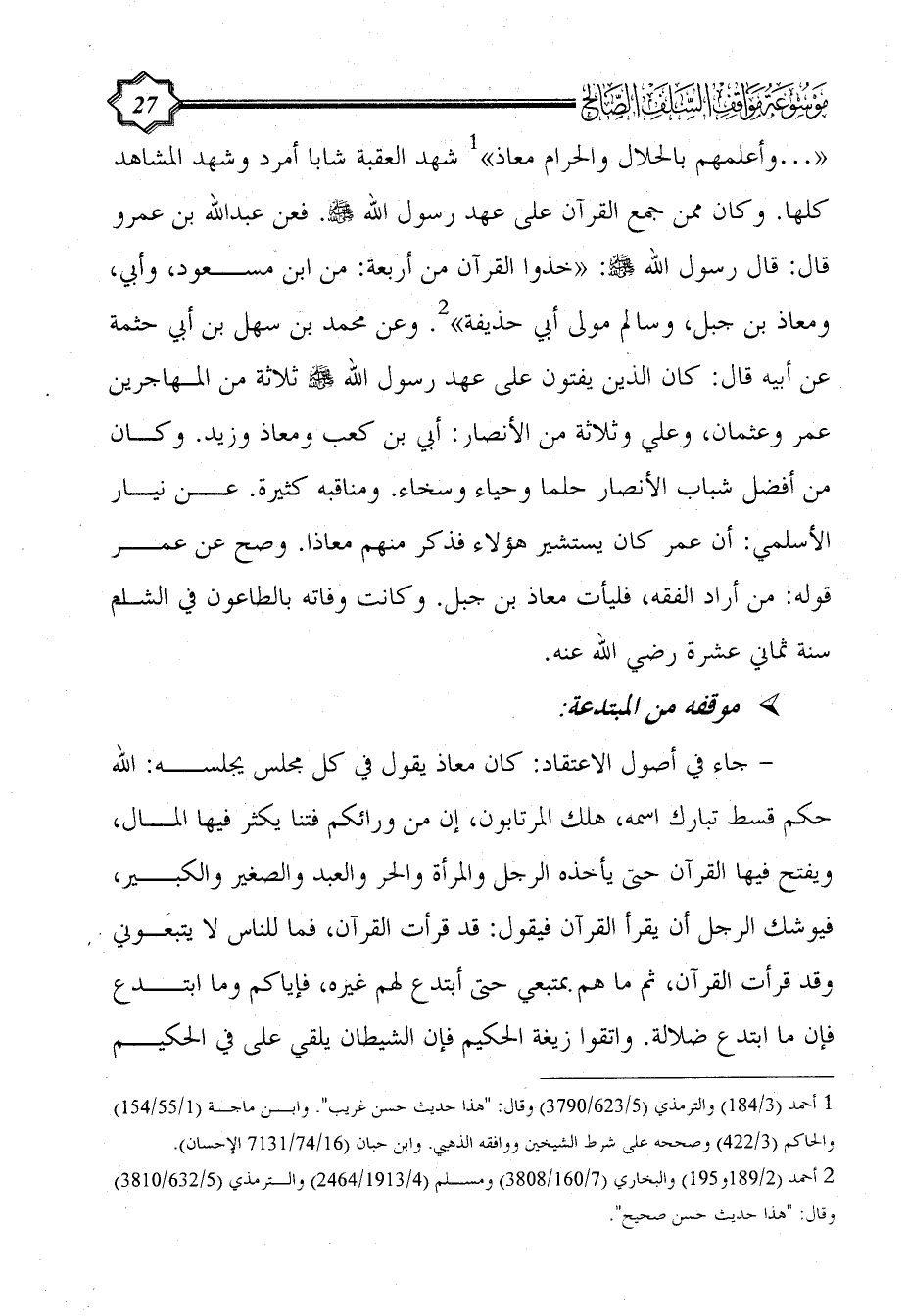 - جاء في أصول الاعتقاد: كان معاذ يقول في كل مجلس يجلسه: الله حكم قسط تبارك اسمه، هلك المرتابون، إن من ورائكم فتنا يكثر فيها المال، ويفتح فيها القرآن حتى يأخذه الرجل والمرأة والحر والعبد والصغير والكبير، فيوشك الرجل أن يقرأ القرآن فيقول: قد قرأت القرآن، فما للناس لا يتبعوني وقد قرأت القرآن، ثم ما هم بمتبعي حتى أبتدع لهم غيره، فإياكم وما ابتدع فإن ما ابتدع ضلالة. واتقوا زيغة الحكيم فإن الشيطان يلقي على في الحكيم