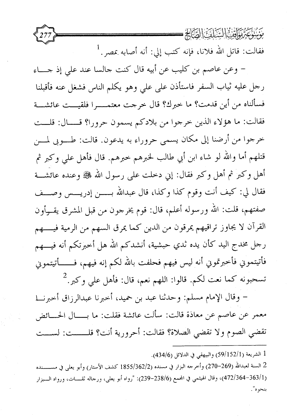 - وعن عاصم بن كليب عن أبيه قال كنت جالسا عند علي إذ جاء رجل عليه ثياب السفر فاستأذن على علي وهو يكلم الناس فشغل عنه فأقبلنا فسألناه من أين قدمت؟ ما خبرك؟ قال خرجت معتمرا فلقيت عائشة فقالت: ما هؤلاء الذين خرجوا من بلادكم يسمون حرورا؟ قال: قلت خرجوا من أرضنا إلى مكان يسمى حروراء به يدعون. قالت: طوبى لمن قتلهم أما والله لو شاء ابن أبي طالب لخبرهم خبرهم. قال فأهل علي وكبر ثم أهل وكبر ثم أهل وكبر فقال: إني دخلت على رسول الله - صلى الله عليه وسلم - وعنده عائشة فقال لي: كيف أنت وقوم كذا وكذا، قال عبد الله بن إدريس وصف صفتهم، قلت: الله ورسوله أعلم، قال: قوم يخرجون من قبل المشرق يقرأون القرآن لا يجاوز تراقيهم يمرقون من الدين كما يمرق السهم من الرمية فيهم رجل مخدج اليد كأن يده ثدي حبشية، أنشدكم الله هل أخبرتكم أنه فيهم فأتيتموني فأخبرتموني أنه ليس فيهم فحلفت بالله لكم إنه فيهم، فأتيتموني تسحبونه كما نعت لكم. قالوا: اللهم نعم، قال: فأهل علي وكبر. (¬2)