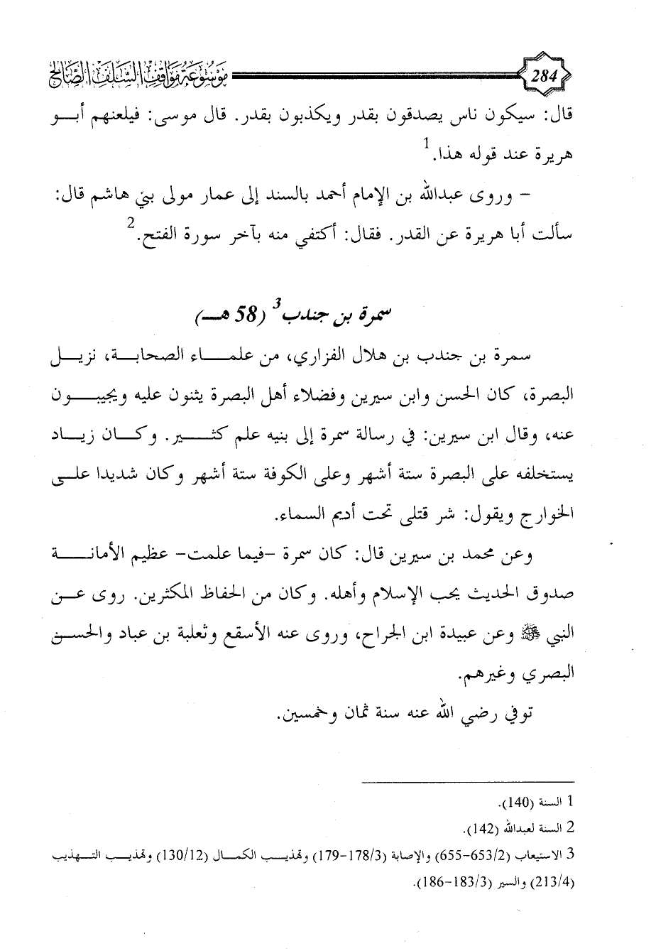 - وروى عبد الله بن الإمام أحمد بالسند إلى عمار مولى بني هاشم قال: سألت أبا هريرة عن القدر. فقال: أكتفي منه بآخر سورة الفتح. (¬2)