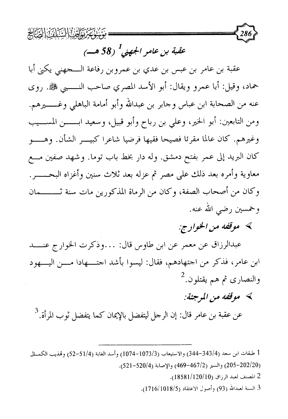 عُقْبَة بن عامر بن عَبْس بن عدي بن عمروبن رفاعة الجُهَنِي يكنى أبا حماد، وقيل: أبا عمرو ويقال: أبو الأسد المصري صاحب النبي - صلى الله عليه وسلم -. روى عنه من الصحابة ابن عباس وجابر بن عبد الله وأبو أمامة الباهلي وغيرهم. ومن التابعين: أبو الخير، وعلي بن رباح وأبو قبيل، وسعيد ابن المسيب وغيرهم. كان عالما مقرئا فصيحا فقيها فرضيا شاعرا كبير الشأن. وهو كان البريد إلى عمر بفتح دمشق. وله دار بخط باب توما. وشهد صفين مع معاوية وأمره بعد ذلك على مصر ثم عزله بعد ثلاث سنين وأغزاه البحر. وكان من أصحاب الصفة، وكان من الرماة المذكورين مات سنة ثمان وخمسين رضي الله عنه.