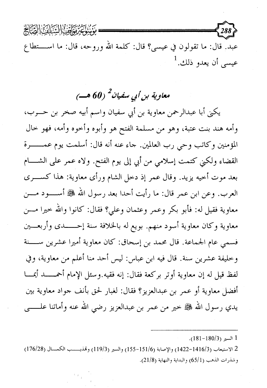 يكنى أبا عبد الرحمن معاوية بن أبي سفيان واسم أبيه صخر بن حرب، وأمه هند بنت عتبة، وهو من مسلمة الفتح هو وأبوه وأخوه وأمه، فهو خال المؤمنين وكاتب وحي رب العالمين. جاء عنه أنه قال: أسلمت يوم عمرة القضاء ولكني كتمت إسلامي من أبي إلى يوم الفتح. ولاه عمر على الشام بعد موت أخيه يزيد. وقال عمر إذ دخل الشام ورأى معاوية: هذا كسرى العرب. وعن ابن عمر قال: ما رأيت أحدا بعد رسول الله - صلى الله عليه وسلم - أسود من معاوية فقيل له: فأبو بكر وعمر وعثمان وعلي؟ فقال: كانوا والله خيرا من معاوية وكان معاوية أسود منهم. بويع له بالخلافة سنة إحدى وأربعين فسمي عام الجماعة. قال محمد بن إسحاق: كان معاوية أميرا عشرين سنة وخليفة عشرين سنة. قال فيه ابن عباس: ليس أحد منا أعلم من معاوية، وفي لفظ قيل له إن معاوية أوتر بركعة فقال: إنه فقيه. وسئل الإمام أحمد أيما أفضل معاوية أو عمر بن عبد العزيز؟ فقال: لغبار لحق بأنف جواد معاوية بين يدي رسول الله - صلى الله عليه وسلم - خير من عمر بن عبد العزيز رضي الله عنه وأماتنا على