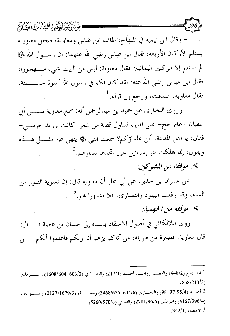 - وقال ابن تيمية في المنهاج: طاف ابن عباس ومعاوية، فجعل معاوية يستلم الأركان الأربعة، فقال ابن عباس رضي الله عنهما: إن رسول الله - صلى الله عليه وسلم - لم يستلم إلا الركنين اليمانيين فقال معاوية: ليس من البيت شيء مهجورا، فقال ابن عباس رضي الله عنه: لقد كان لكم في رسول الله أسوة حسنة، فقال معاوية: صدقت، ورجع إلى قوله. (¬1)