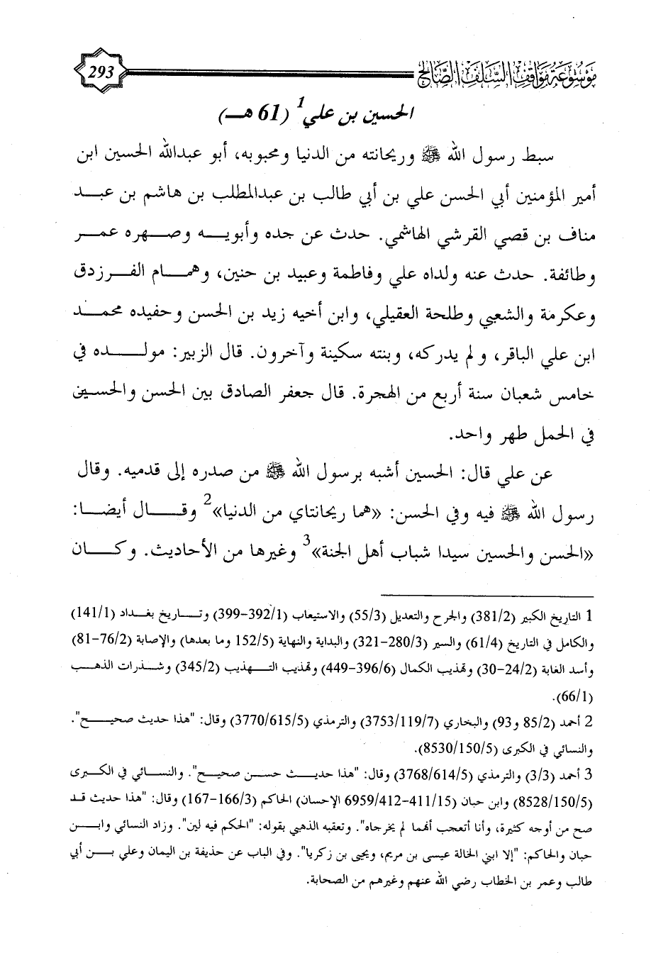 سبط رسول الله - صلى الله عليه وسلم - وريحانته من الدنيا ومحبوبه، أبو عبد الله الحسين ابن أمير المؤمنين أبي الحسن علي بن أبي طالب بن عبد المطلب بن هاشم بن عبد مناف بن قصي القرشي الهاشمي. حدث عن جده وأبويه وصهره عمر وطائفة. حدث عنه ولداه علي وفاطمة وعبيد بن حنين، وهمام الفرزدق وعكرمة والشعبي وطلحة العقيلي، وابن أخيه زيد بن الحسن وحفيده محمد ابن علي الباقر، ولم يدركه، وبنته سكينة وآخرون. قال الزبير: مولده في خامس شعبان سنة أربع من الهجرة. قال جعفر الصادق بين الحسن والحسين في الحمل طهر واحد.