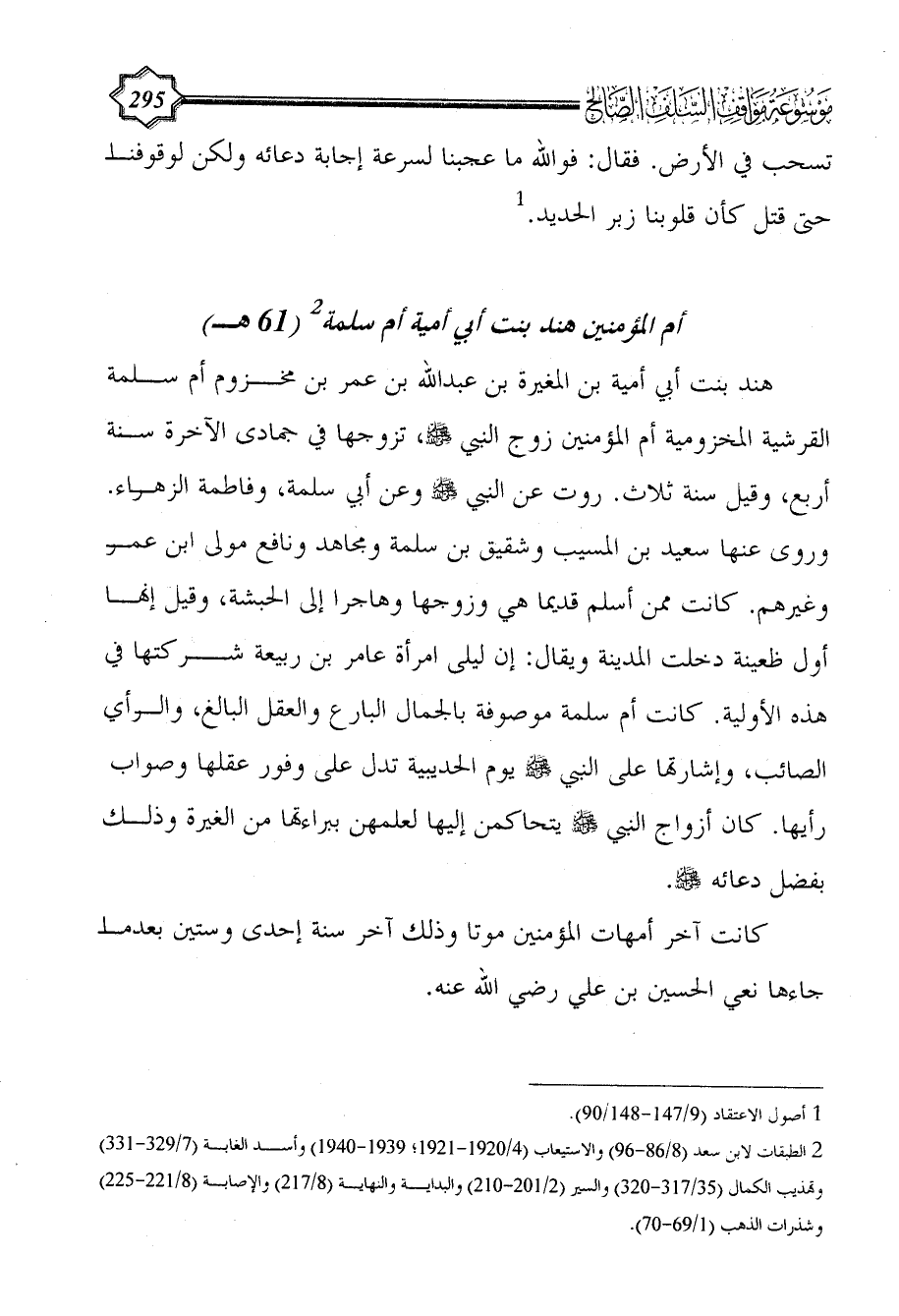 هند بنت أبي أمية بن المغيرة بن عبد الله بن عمر بن مخزوم أم سلمة القرشية المخزومية أم المؤمنين زوج النبي - صلى الله عليه وسلم -، تزوجها في جمادى الآخرة سنة أربع، وقيل سنة ثلاث. روت عن النبي - صلى الله عليه وسلم - وعن أبي سلمة، وفاطمة الزهراء. وروى عنها سعيد بن المسيب وشقيق بن سلمة ومجاهد ونافع مولى ابن عمر وغيرهم. كانت ممن أسلم قديما هي وزوجها وهاجرا إلى الحبشة، وقيل إنها أول ظعينة دخلت المدينة ويقال: إن ليلى امرأة عامر بن ربيعة شركتها في هذه الأولية. كانت أم سلمة موصوفة بالجمال البارع والعقل البالغ، والرأي الصائب، وإشارتها على النبي - صلى الله عليه وسلم - يوم الحديبية تدل على وفور عقلها وصواب رأيها. كان أزواج النبي - صلى الله عليه وسلم - يتحاكمن إليها لعلمهن ببراءتها من الغيرة وذلك بفضل دعائه - صلى الله عليه وسلم -.