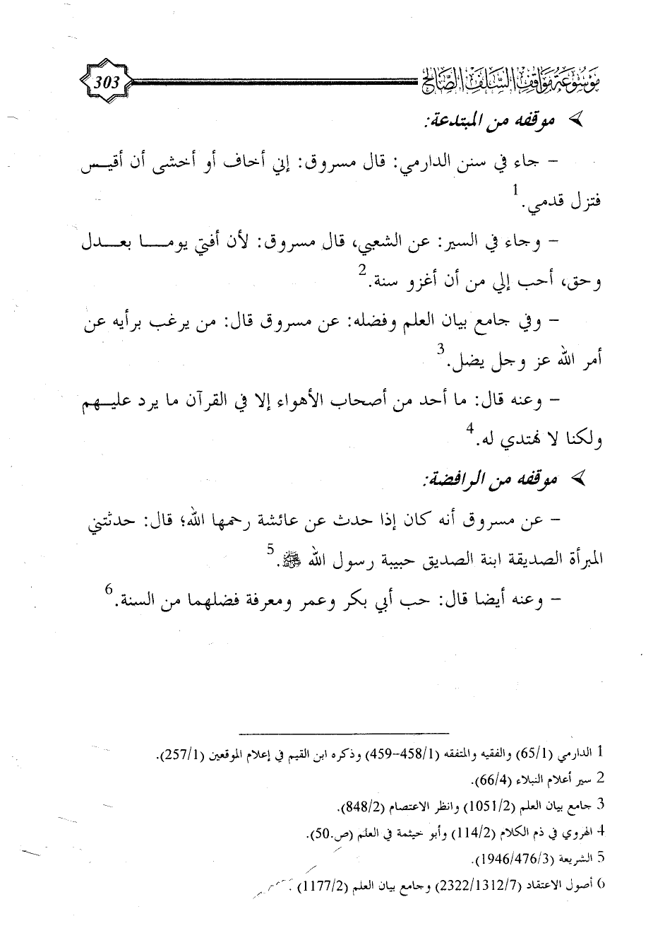 - جاء في سنن الدارمي: قال مسروق: إني أخاف أو أخشى أن أقيس فتزل قدمي. (¬1)