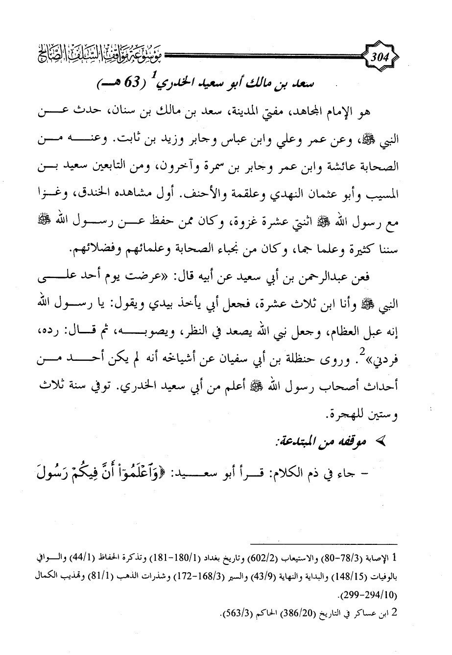 فعن عبد الرحمن بن أبي سعيد عن أبيه قال: "عرضت يوم أحد على النبي - صلى الله عليه وسلم - وأنا ابن ثلاث عشرة، فجعل أبي يأخذ بيدي ويقول: يا رسول الله إنه عبل العظام، وجعل نبي الله يصعد فيّ النظر، ويصوبه، ثم قال: رده، فردني" (¬2). وروى حنظلة بن أبي سفيان عن أشياخه أنه لم يكن أحد من أحداث أصحاب رسول الله - صلى الله عليه وسلم - أعلم من أبي سعيد الخدري. توفي سنة ثلاث وستين للهجرة.