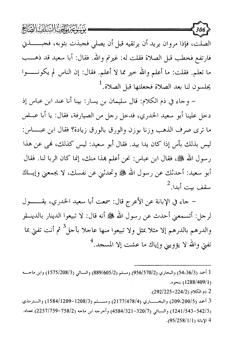 - وجاء في ذم الكلام: قال سليمان بن يسار: بينا أنا عند ابن عباس إذ دخل علينا أبو سعيد الخدري، فدخل رجل من الصيارفة، فقال: يا أبا عباس ما ترى صرف الذهب وزنا بوزن والورق بالورق زيادة؟ فقال ابن عباس: ليس بذلك بأس إذا كان يدا بيد. فقال أبو سعيد: ليس كذلك، نهى عن هذا رسول الله - صلى الله عليه وسلم -، فقال ابن عباس: نحن أعلم بهذا منك، إنما كان الربا لنا. فقال أبو سعيد: أحدثك عن رسول الله - صلى الله عليه وسلم - وتحدثني عن نفسك، لا يجمعني وإياك سقف بيت أبدا. (¬2)