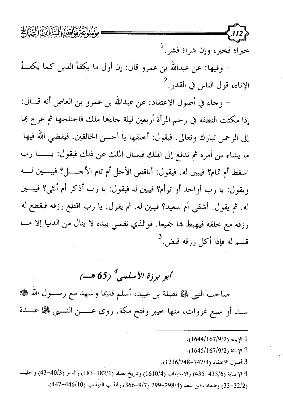 - وجاء في أصول الاعتقاد: عن عبد الله بن عمرو بن العاص أنه قال: إذا مكثت النطفة في رحم المرأة أربعين ليلة جاءها ملك فاختلجها ثم عرج بها إلى الرحمن تبارك وتعالى. فيقول: أخلقها يا أحسن الخالقين. فيقضي الله فيها ما يشاء من أمره ثم تدفع إلى الملك فيسال الملك عن ذلك فيقول: يا رب اسقط أم تمام؟ فيبين له. فيقول: أناقص الأجل أم تام الأجل؟ فيبين له ويقول: يا رب أواحد أو توأم؟ فيبين له فيقول: يا رب أذكر أم أنثى؟ فيبين له. ثم يقول: أشقي أم سعيد؟ فيبين له. ثم يقول: يا رب اقطع رزقه فيقطع له رزقه مع خلقه فيهبط بها جميعا. فوالذي نفسي بيده لا ينال من الدنيا إلا ما قسم له فإذا أكل رزقه قبض. (¬3)