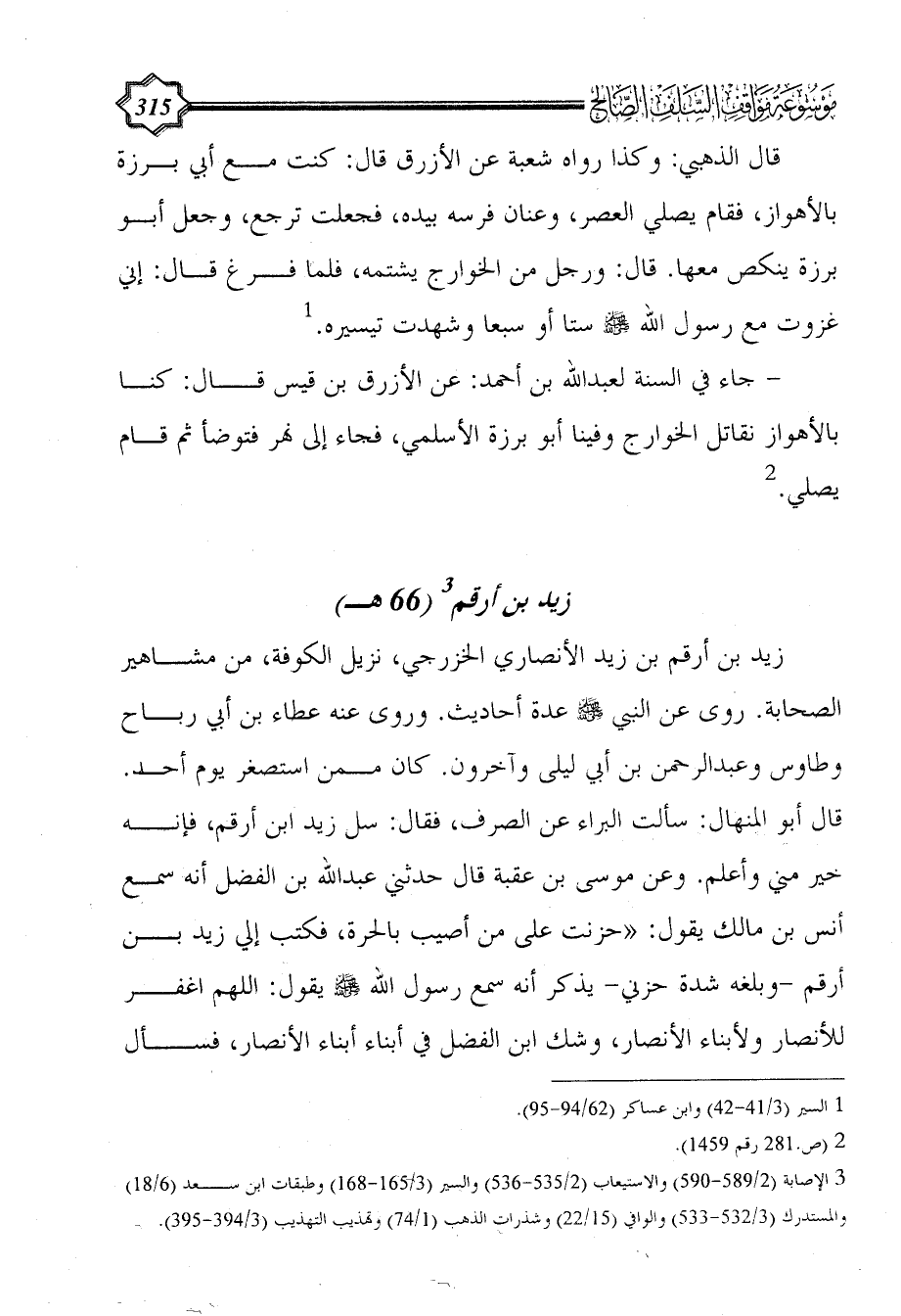 قال الذهبي: وكذا رواه شعبة عن الأزرق قال: كنت مع أبي برزة بالأهواز، فقام يصلي العصر، وعنان فرسه بيده، فجعلت ترجع، وجعل أبو برزة ينكص معها. قال: ورجل من الخوارج يشتمه، فلما فرغ قال: إني غزوت مع رسول الله - صلى الله عليه وسلم - ستا أو سبعا وشهدت تيسيره. (¬1)