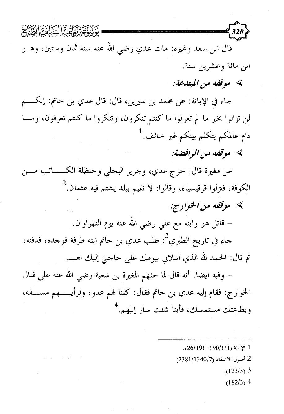 - وفيه أيضا: أنه قال لما حثهم المغيرة بن شعبة رضي الله عنه على قتال الخوارج: فقام إليه عدي بن حاتم فقال: كلنا لهم عدو، ولرأيهم مسفه، وبطاعتك مستمسك، فأينا شئت سار إليهم. (¬4)