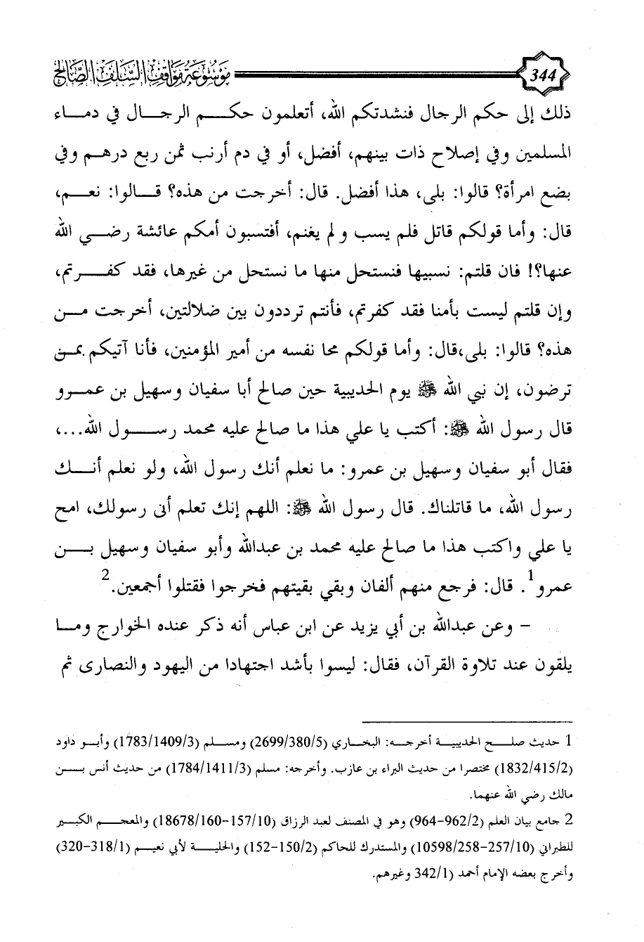 ذلك إلى حكم الرجال فنشدتكم الله، أتعلمون حكم الرجال في دماء المسلمين وفي إصلاح ذات بينهم، أفضل، أو في دم أرنب ثمن ربع درهم وفي بضع امرأة؟ قالوا: بلى، هذا أفضل. قال: أخرجت من هذه؟ قالوا: نعم، قال: وأما قولكم قاتل فلم يسب ولم يغنم، أفتسبون أمكم عائشة رضي الله عنها؟! فان قلتم: نسبيها فنستحل منها ما نستحل من غيرها، فقد كفرتم، وإن قلتم ليست بأمنا فقد كفرتم، فأنتم ترددون بين ضلالتين، أخرجت من هذه؟ قالوا: بلى، قال: وأما قولكم محا نفسه من أمير المؤمنين، فأنا آتيكم بمن ترضون، إن نبي الله - صلى الله عليه وسلم - يوم الحديبية حين صالح أبا سفيان وسهيل بن عمرو قال رسول الله - صلى الله عليه وسلم -: أكتب يا علي هذا ما صالح عليه محمد رسول الله ... ، فقال أبو سفيان وسهيل بن عمرو: ما نعلم أنك رسول الله، ولو نعلم أنك رسول الله، ما قاتلناك.