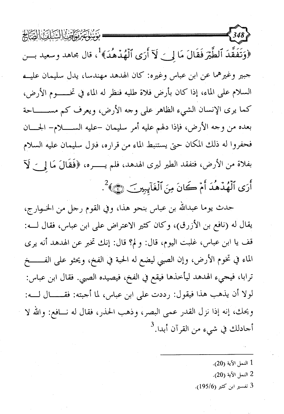 حدث يوما عبد الله بن عباس بنحو هذا، وفي القوم رجل من الخوارج، يقال له (نافع بن الأزرق)، وكان كثير الاعتراض على ابن عباس، فقال له: قف يا ابن عباس، غلبت اليوم، قال: ولم؟ قال: إنك تخبر عن الهدهد أنه يرى الماء في تخوم الأرض، وإن الصبي ليضع له الحبة في الفخ، ويحثو على الفخ ترابا، فيجيء الهدهد ليأخذها فيقع في الفخ، فيصيده الصبي. فقال ابن عباس: لولا أن يذهب هذا فيقول: رددت على ابن عباس، لما أجبته: فقال له: ويحك، إنه إذا نزل القدر عمى البصر، وذهب الحذر، فقال له نافع: والله لا أجادلك في شيء من القرآن أبدا. (¬3)