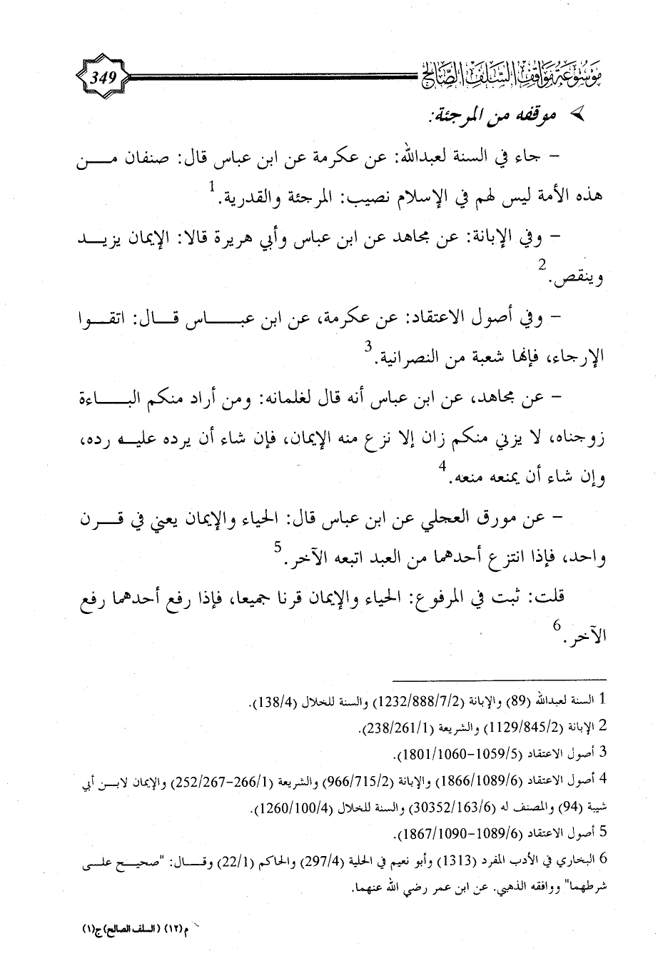 - جاء في السنة لعبد الله: عن عكرمة عن ابن عباس قال: صنفان من هذه الأمة ليس لهم في الإسلام نصيب: المرجئة والقدرية. (¬1)