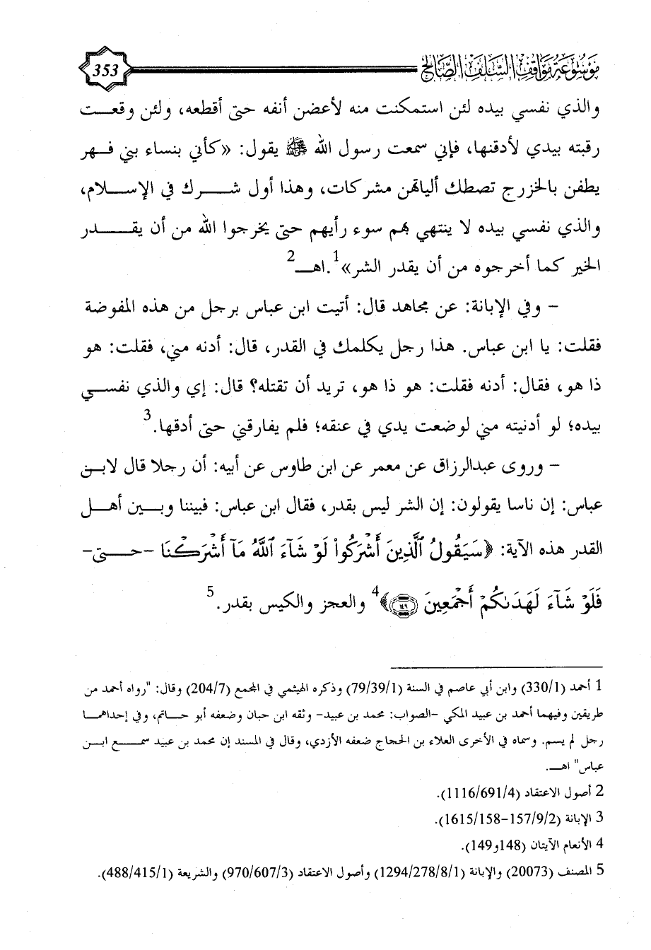 - وفي الإبانة: عن مجاهد قال: أتيت ابن عباس برجل من هذه المفوضة فقلت: يا ابن عباس. هذا رجل يكلمك في القدر، قال: أدنه مني، فقلت: هو ذا هو، فقال: أدنه فقلت: هو ذا هو، تريد أن تقتله؟ قال: إي والذي نفسي بيده؛ لو أدنيته مني لوضعت يدي في عنقه؛ فلم يفارقني حتى أدقها. (¬3)