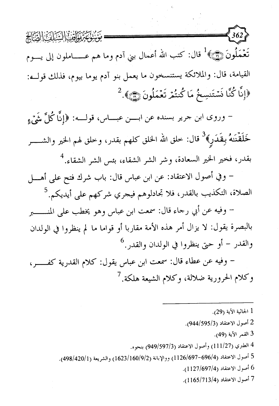 - وفي أصول الاعتقاد: عن ابن عباس قال: باب شرك فتح على أهل الصلاة، التكذيب بالقدر، فلا تجادلوهم فيجري شركهم على أيديكم. (¬5)