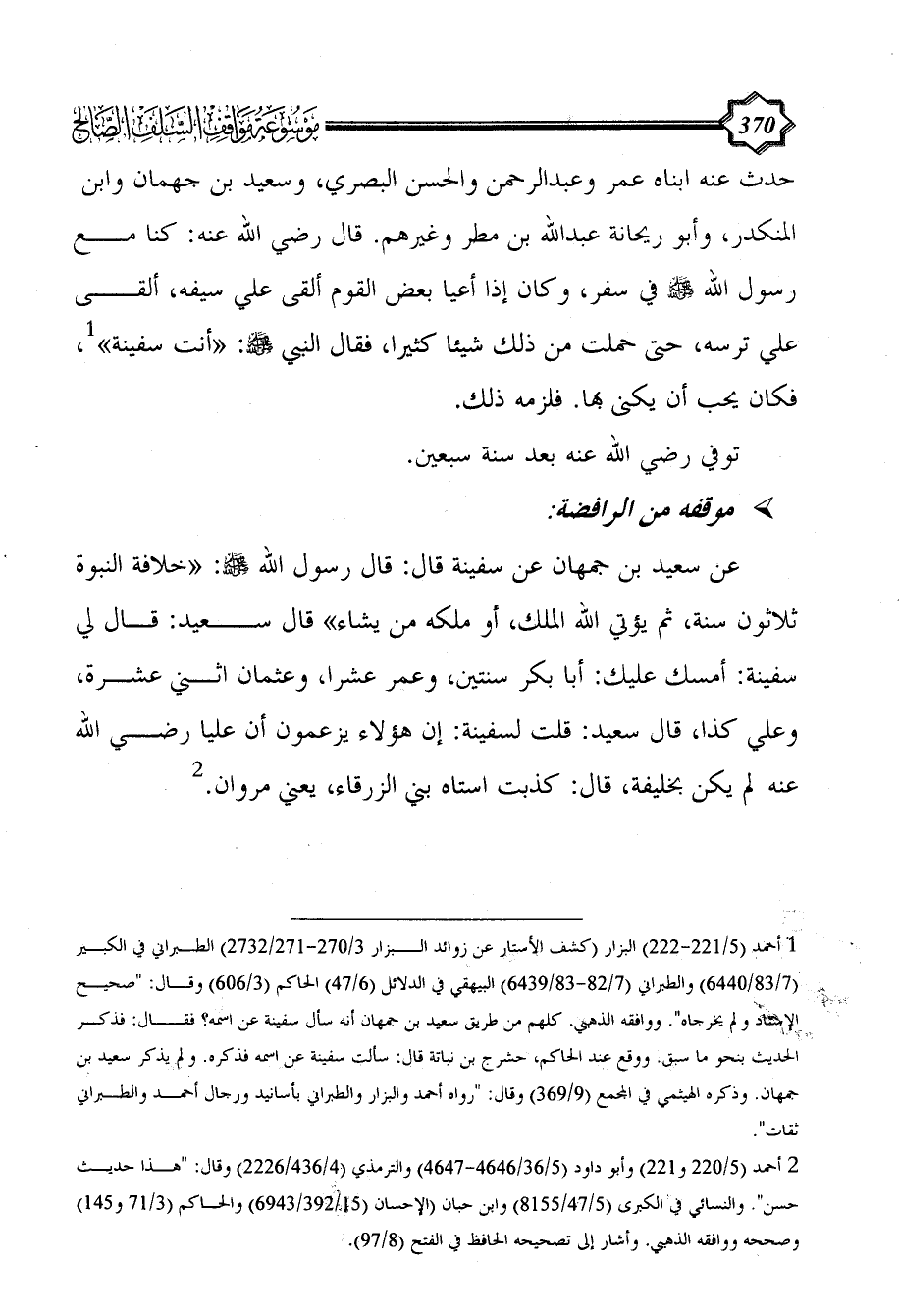 (¬1) أحمد (5/ 221 - 222) البزار (كشف الأستار عن زوائد البزار 3/ 270 - 271/ 2732) الطبراني في الكبير (7/ 83/6440) والطبراني (7/ 82 - 83/ 6439) البيهقي في الدلائل (6/ 47) الحاكم (3/ 606) وقال: "صحيح الإسناد ولم يخرجاه". ووافقه الذهبي. كلهم من طريق سعيد بن جمهان أنه سأل سفينة عن اسمه؟ فقال: فذكر الحديث بنحو ما سبق. ووقع عند الحاكم، حشرج بن نباتة قال: سألت سفينة عن اسمه فذكره. ولم يذكر سعيد بن جمهان. وذكره الهيثمي في المجمع (9/ 369) وقال: "رواه أحمد والبزار والطبراني بأسانيد ورجال أحمد والطبراني ثقات".