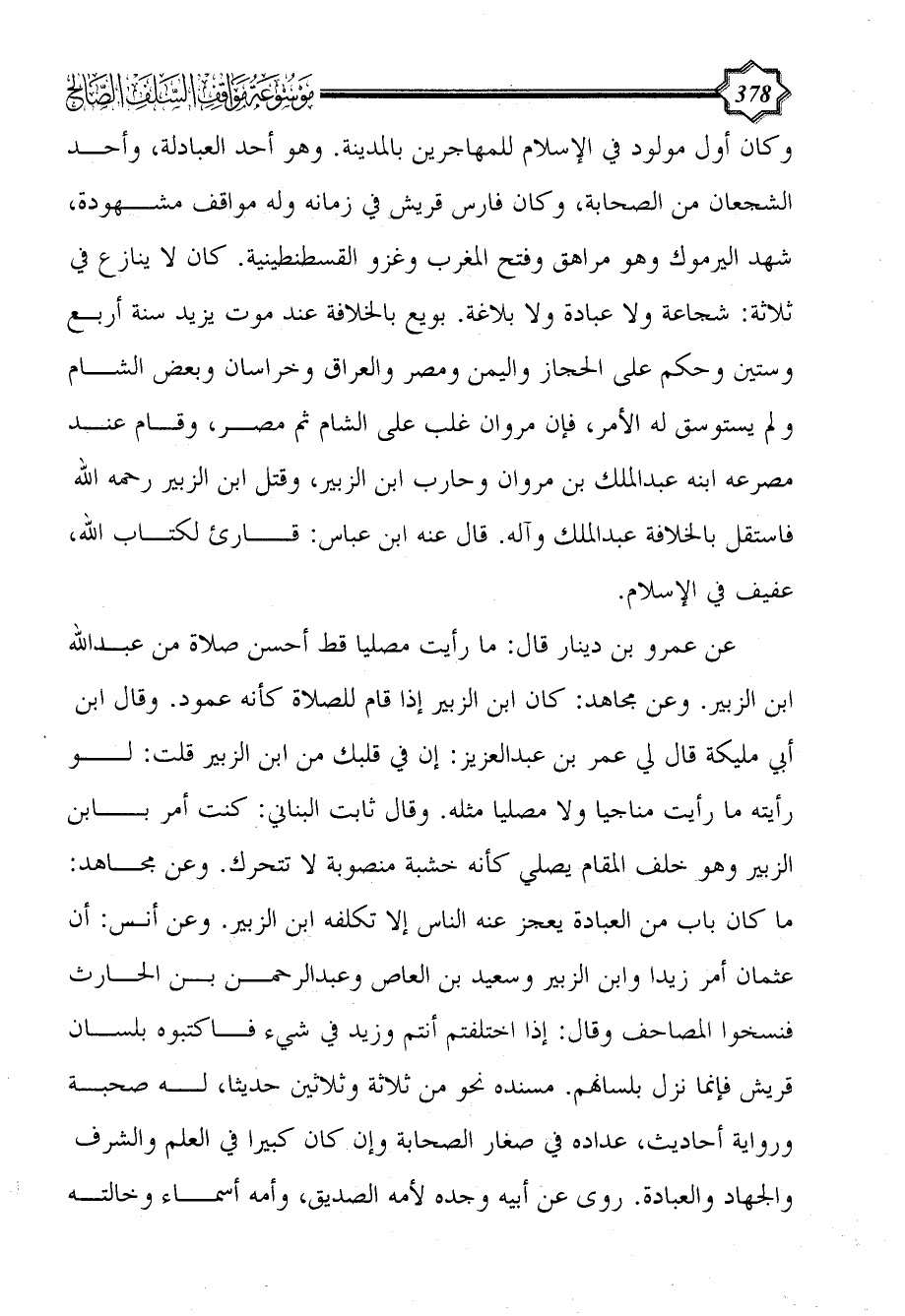 عن عمرو بن دينار قال: ما رأيت مصليا قط أحسن صلاة من عبد الله ابن الزبير. وعن مجاهد: كان ابن الزبير إذا قام للصلاة كأنه عمود. وقال ابن أبي مليكة قال لي عمر بن عبد العزيز: إن في قلبك من ابن الزبير قلت: لو رأيته ما رأيت مناجيا ولا مصليا مثله. وقال ثابت البناني: كنت أمر بابن الزبير وهو خلف المقام يصلي كأنه خشبة منصوبة لا تتحرك. وعن مجاهد: ما كان باب من العبادة يعجز عنه الناس إلا تكلفه ابن الزبير. وعن أنس: أن عثمان أمر زيدا وابن الزبير وسعيد بن العاص وعبد الرحمن بن الحارث فنسخوا المصاحف وقال: إذا اختلفتم أنتم وزيد في شيء فاكتبوه بلسان قريش فإنما نزل بلسانهم. مسنده نحو من ثلاثة وثلاثين حديثا، له صحبة ورواية أحاديث، عداده في صغار الصحابة وإن كان كبيرا في العلم والشرف والجهاد والعبادة. روى عن أبيه وجده لأمه الصديق، وأمه أسماء وخالته
