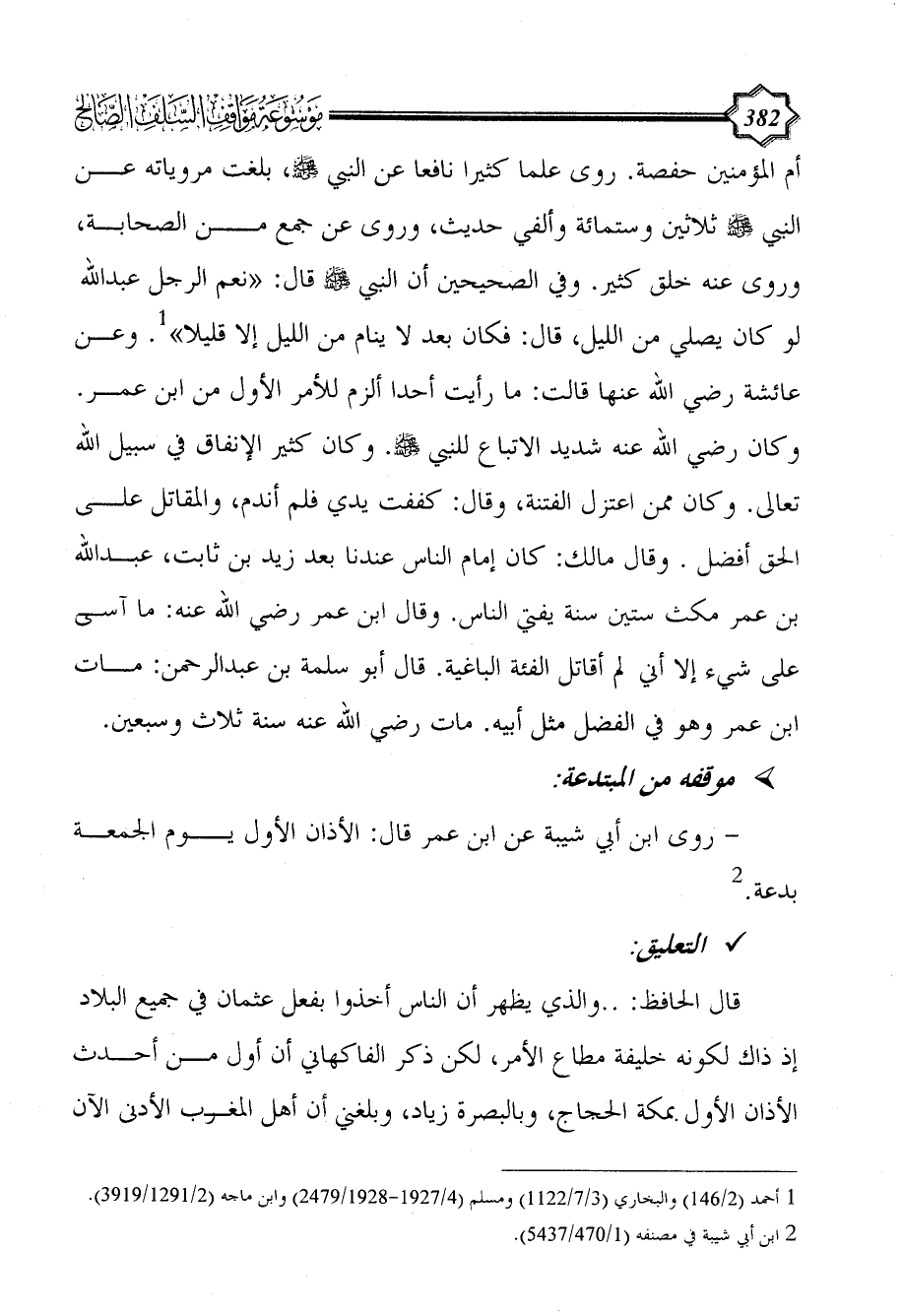 - روى ابن أبي شيبة عن ابن عمر قال: الأذان الأول يوم الجمعة بدعة. (¬2)