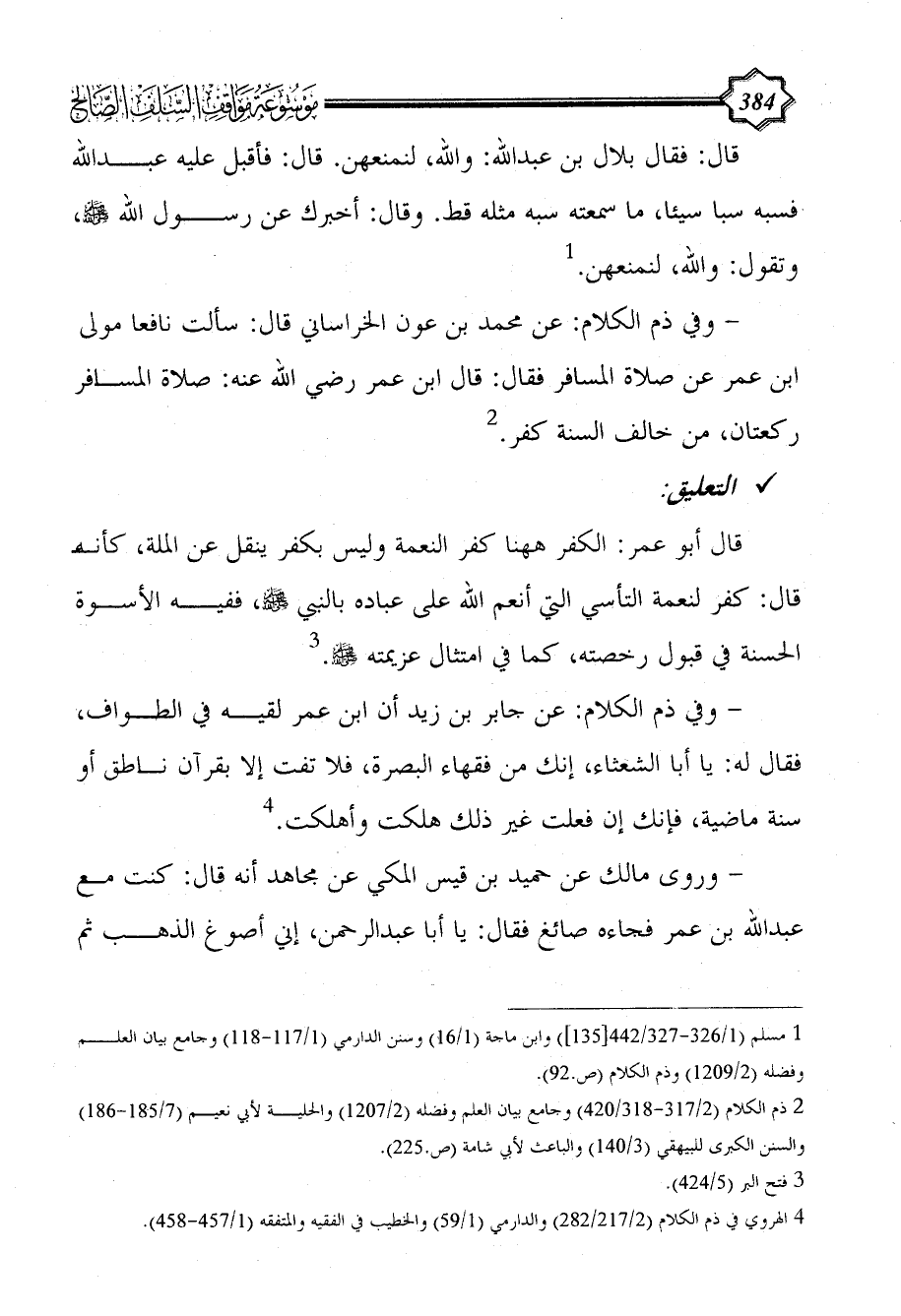 - وفي ذم الكلام: عن محمد بن عون الخراساني قال: سألت نافعا مولى ابن عمر عن صلاة المسافر فقال: قال ابن عمر رضي الله عنه: صلاة المسافر ركعتان، من خالف السنة كفر. (¬2)