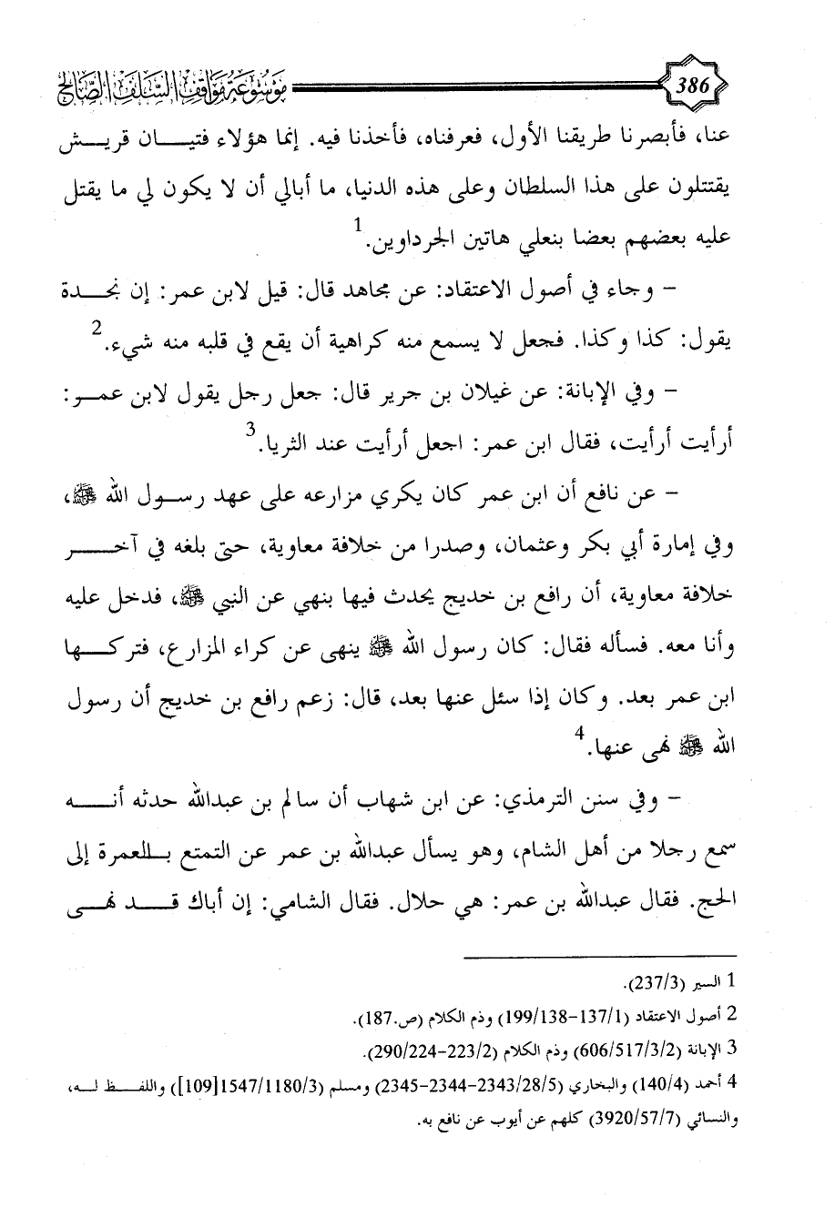 - وجاء في أصول الاعتقاد: عن مجاهد قال: قيل لابن عمر: إن نجدة يقول: كذا وكذا. فجعل لا يسمع منه كراهية أن يقع في قلبه منه شيء. (¬2)