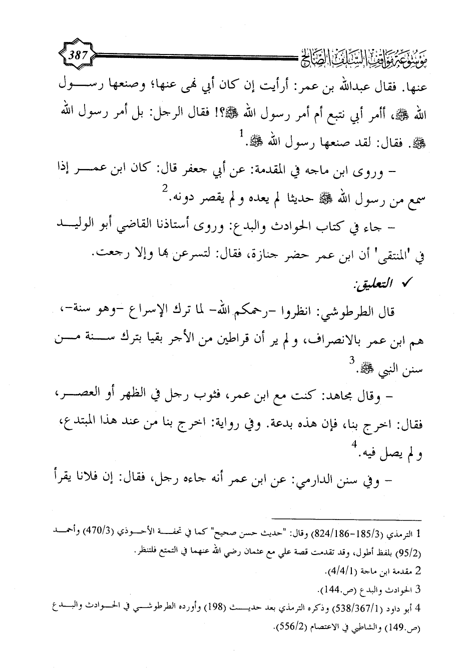 - جاء في كتاب الحوادث والبدع: وروى أستاذنا القاضي أبو الوليد في 'المنتقى' أن ابن عمر حضر جنازة، فقال: لتسرعن بها وإلا رجعت.