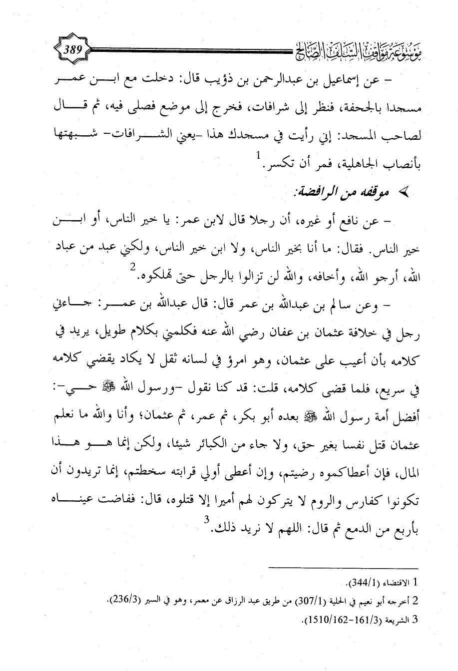 - عن إسماعيل بن عبد الرحمن بن ذؤيب قال: دخلت مع ابن عمر مسجدا بالجحفة، فنظر إلى شرافات، فخرج إلى موضع فصلى فيه، ثم قال لصاحب المسجد: إني رأيت في مسجدك هذا -يعني الشرافات- شبهتها بأنصاب الجاهلية، فمر أن تكسر. (¬1)