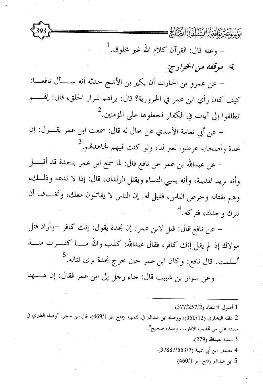 - عن أبي نعامة الأسدي عن خال له قال: سمعت ابن عمر يقول: إن نجدة وأصحابه عرضوا لعير لنا، ولو كنت فيهم لجاهدتهم. (¬3)