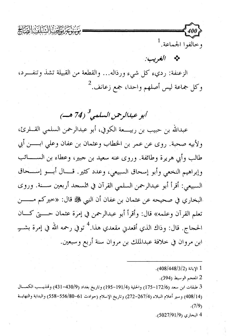 عبد الله بن حبيب بن رُبَيِّعَة الكوفي، أبو عبد الرحمن السُّلَمِي القارئ، ولأبيه صحبة. روى عن عمر بن الخطاب وعثمان بن عفان وعلي ابن أبي طالب وأبي هريرة وطائفة. وروى عنه سعيد بن جبير، وعطاء بن السائب وإبراهيم النخعي وأبو إسحاق السبيعي، وعدد كثير. قال أبو إسحاق السبيعي: أقرأ أبو عبد الرحمن السلمي القرآن في المسجد أربعين سنة. وروى البخاري في صحيحه عن عثمان بن عفان أن النبي - صلى الله عليه وسلم - قال: "خيركم من تعلم القرآن وعلمه" قال: وأقرأ أبو عبد الرحمن في إمرة عثمان حتى كان الحجاج. قال: وذاك الذي أقعدني مقعدي هذا. (¬4) توفي رحمه الله في إمرة بشر ابن مروان في خلافة عبد الملك بن مروان سنة أربع وسبعين.