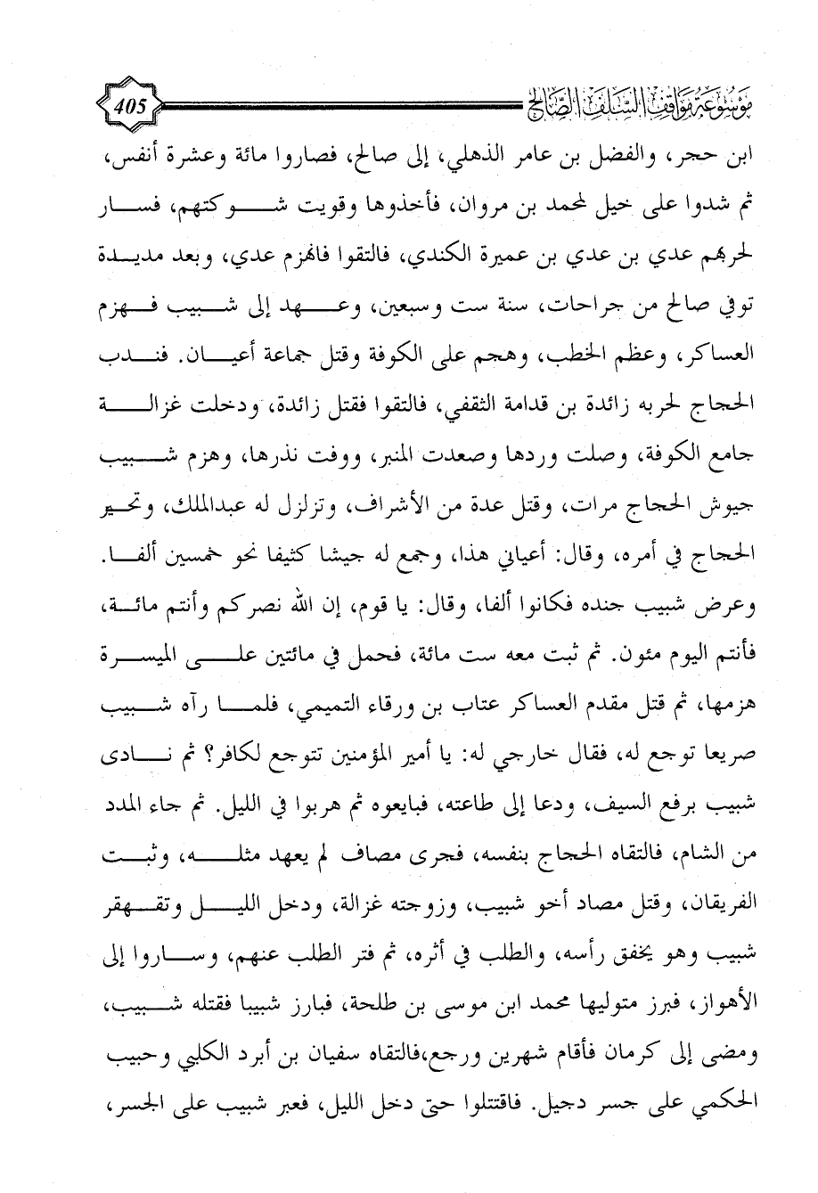 ابن حجر، والفضل بن عامر الذهلي، إلى صالح، فصاروا مائة وعشرة أنفس، ثم شدوا على خيل لمحمد بن مروان، فأخذوها وقويت شوكتهم، فسار لحربهم عدي بن عدي بن عميرة الكندي، فالتقوا فانهزم عدي، وبعد مديدة توفي صالح من جراحات، سنة ست وسبعين، وعهد إلى شبيب فهزم العساكر، وعظم الخطب، وهجم على الكوفة وقتل جماعة أعيان. فندب الحجاج لحربه زائدة بن قدامة الثقفي، فالتقوا فقتل زائدة، ودخلت غزالة جامع الكوفة، وصلت وردها وصعدت المنبر، ووفت نذرها، وهزم شبيب جيوش الحجاج مرات، وقتل عدة من الأشراف، وتزلزل له عبد الملك، وتحير الحجاج في أمره، وقال: أعياني هذا، وجمع له جيشا كثيفا نحو خمسين ألفا. وعرض شبيب جنده فكانوا ألفا، وقال: يا قوم، إن الله نصركم وأنتم مائة، فأنتم اليوم مئون. ثم ثبت معه ست مائة، فحمل في مائتين على الميسرة هزمها، ثم قتل مقدم العساكر عتاب بن ورقاء التميمي، فلما رآه شبيب صريعا توجع له، فقال خارجي له: يا أمير المؤمنين تتوجع لكافر؟ ثم نادى شبيب برفع السيف، ودعا إلى طاعته، فبايعوه ثم هربوا في الليل.