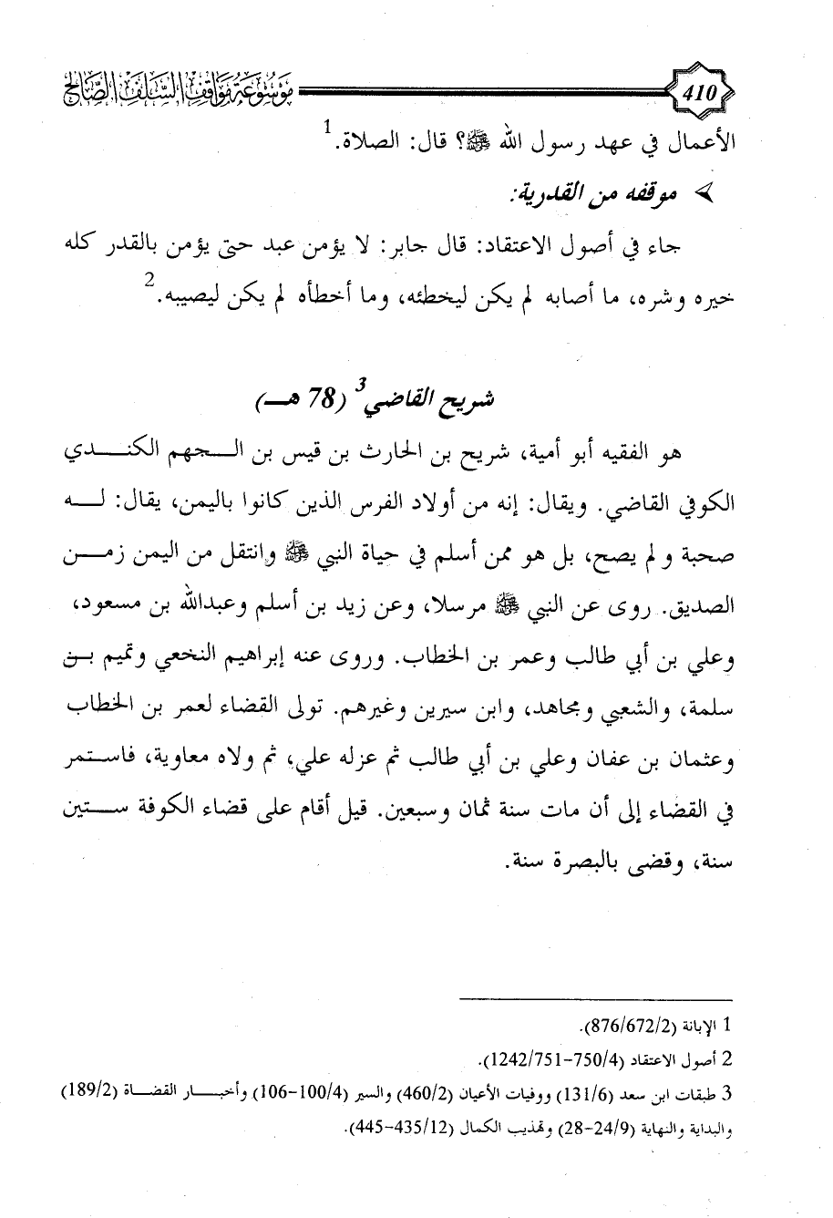 جاء في أصول الاعتقاد: قال جابر: لا يؤمن عبد حتى يؤمن بالقدر كله خيره وشره، ما أصابه لم يكن ليخطئه، وما أخطأه لم يكن ليصيبه. (¬2)