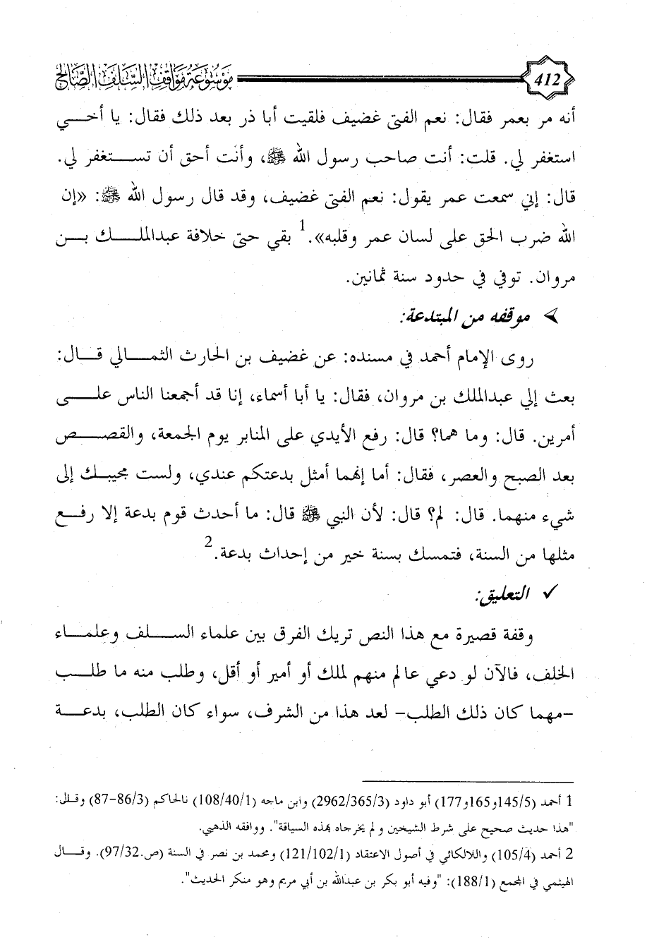 روى الإمام أحمد في مسنده: عن غضيف بن الحارث الثمالي قال: بعث إلي عبد الملك بن مروان، فقال: يا أبا أسماء، إنا قد أجمعنا الناس على أمرين. قال: وما هما؟ قال: رفع الأيدي على المنابر يوم الجمعة، والقصص بعد الصبح والعصر، فقال: أما إنهما أمثل بدعتكم عندي، ولست مجيبك إلى شيء منهما. قال: لم؟ قال: لأن النبي - صلى الله عليه وسلم - قال: ما أحدث قوم بدعة إلا رفع مثلها من السنة، فتمسك بسنة خير من إحداث بدعة. (¬2)