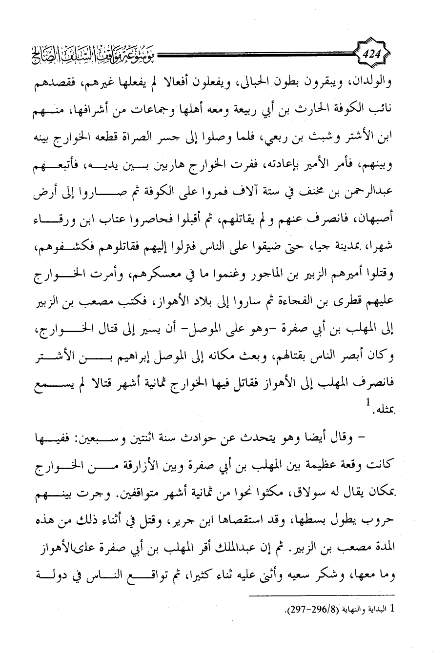 - وقال أيضا وهو يتحدث عن حوادث سنة اثنتين وسبعين: ففيها كانت وقعة عظيمة بين المهلب بن أبي صفرة وبين الأزارقة من الخوارج بمكان يقال له سولاق، مكثوا نحوا من ثمانية أشهر متواقفين. وجرت بينهم حروب يطول بسطها، وقد استقصاها ابن جرير، وقتل في أثناء ذلك من هذه المدة مصعب بن الزبير. ثم إن عبد الملك أقر المهلب بن أبي صفرة علىالأهواز وما معها، وشكر سعيه وأثنى عليه ثناء كثيرا، ثم تواقع الناس في دولة