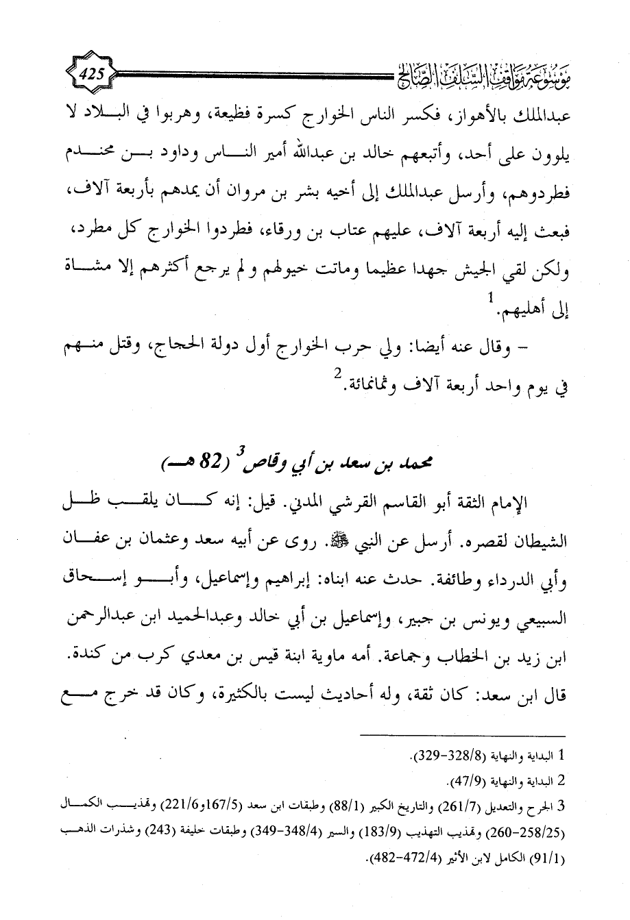 - وقال عنه أيضا: ولي حرب الخوارج أول دولة الحجاج، وقتل منهم في يوم واحد أربعة آلاف وثمانمائة. (¬2)