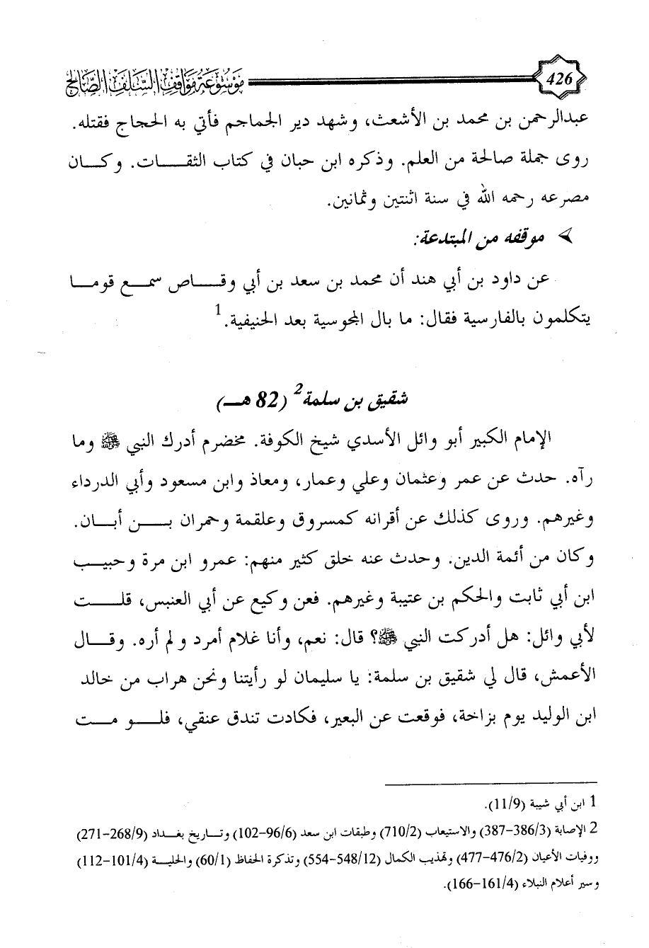 (¬2) الإصابة (3/ 386 - 387) والاستيعاب (2/ 710) وطبقات ابن سعد (6/ 96 - 102) وتاريخ بغداد (9/ 268 - 271) ووفيات الأعيان (2/ 476 - 477) وتهذيب الكمال (12/ 548 - 554) وتذكرة الحفاظ (1/ 60) والحلية (4/ 101 - 112) وسير أعلام النبلاء (4/ 161 - 166).