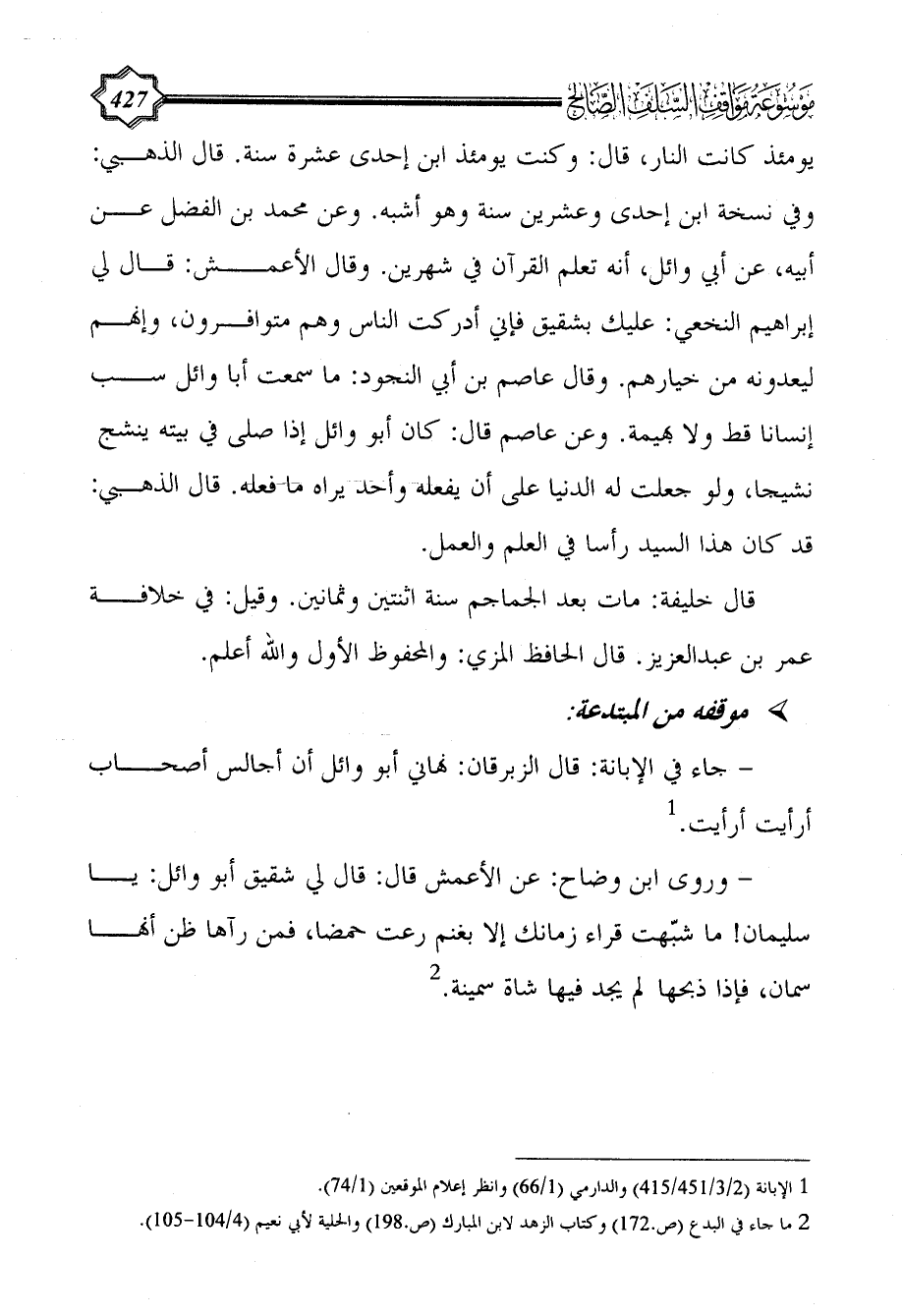 (¬2) ما جاء في البدع (ص.172) وكتاب الزهد لابن المبارك (ص.198) والحلية لأبي نعيم (4/ 104 - 105).