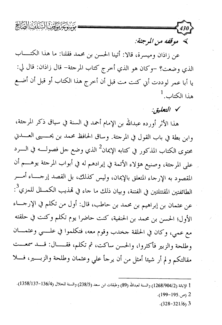 هذا الأثر أورده عبد الله بن الإمام أحمد في السنة في سياق ذكر المرجئة، وابن بطة في باب القول في المرجئة. وساق الحافظ محمد بن يحيى العدني محتوى الكتاب المذكور في كتابه الإيمان (¬2) الذي وضع جل فصوله في الرد على المرجئة، وصنيع هؤلاء الأئمة في إيرادهم له في أبواب المرجئة يوهم أن المقصود به الإرجاء المتعلق بالإيمان، وليس كذلك، بل القصد إرجاء أمر الطائفتين المقتتلتين في الفتنة، وبيان ذلك ما جاء في تهذيب الكمال للمزي (¬3): عن عثمان بن إبراهيم بن محمد بن حاطب، قال: أول من تكلم في الإرجاء الأول؛ الحسن بن محمد بن الحنفية، كنت حاضرا يوم تكلم وكنت في حلقته مع عمي، وكان في الحلقة جخدب وقوم معه، فتكلموا في علي وعثمان وطلحة والزبير فأكثروا، والحسن ساكت، ثم تكلم، فقال: قد سمعت مقالتكم ولم أر شيئا أمثل من أن يرجأ علي وعثمان وطلحة والزبير، فلا