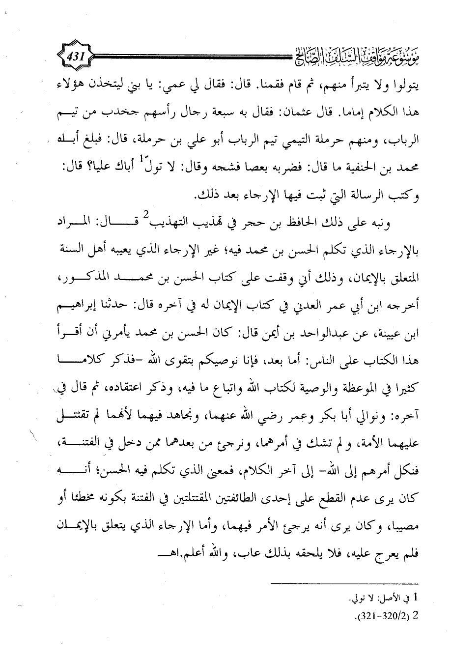 ونبه على ذلك الحافظ بن حجر في تهذيب التهذيب (¬2) قال: المراد بالإرجاء الذي تكلم الحسن بن محمد فيه؛ غير الإرجاء الذي يعيبه أهل السنة المتعلق بالإيمان، وذلك أني وقفت على كتاب الحسن بن محمد المذكور، أخرجه ابن أبي عمر العدني في كتاب الإيمان له في آخره قال: حدثنا إبراهيم ابن عيينة، عن عبد الواحد بن أيمن قال: كان الحسن بن محمد يأمرني أن أقرأ هذا الكتاب على الناس: أما بعد، فإنا نوصيكم بتقوى الله -فذكر كلاما كثيرا في الموعظة والوصية لكتاب الله واتباع ما فيه، وذكر اعتقاده، ثم قال في آخره: ونوالي أبا بكر وعمر رضي الله عنهما، ونجاهد فيهما لأنهما لم تقتتل عليهما الأمة، ولم تشك في أمرهما، ونرجئ من بعدهما ممن دخل في الفتنة، فنكل أمرهم إلى الله- إلى آخر الكلام، فمعنى الذي تكلم فيه الحسن؛ أنه كان يرى عدم القطع على إحدى الطائفتين المقتتلتين في الفتنة بكونه مخطئا أو مصيبا، وكان يرى أنه يرجئ الأمر فيهما، وأما الإرجاء الذي يتعلق بالإيمان فلم يعرج عليه، فلا يلحقه بذلك عاب، والله أعلم. اهـ