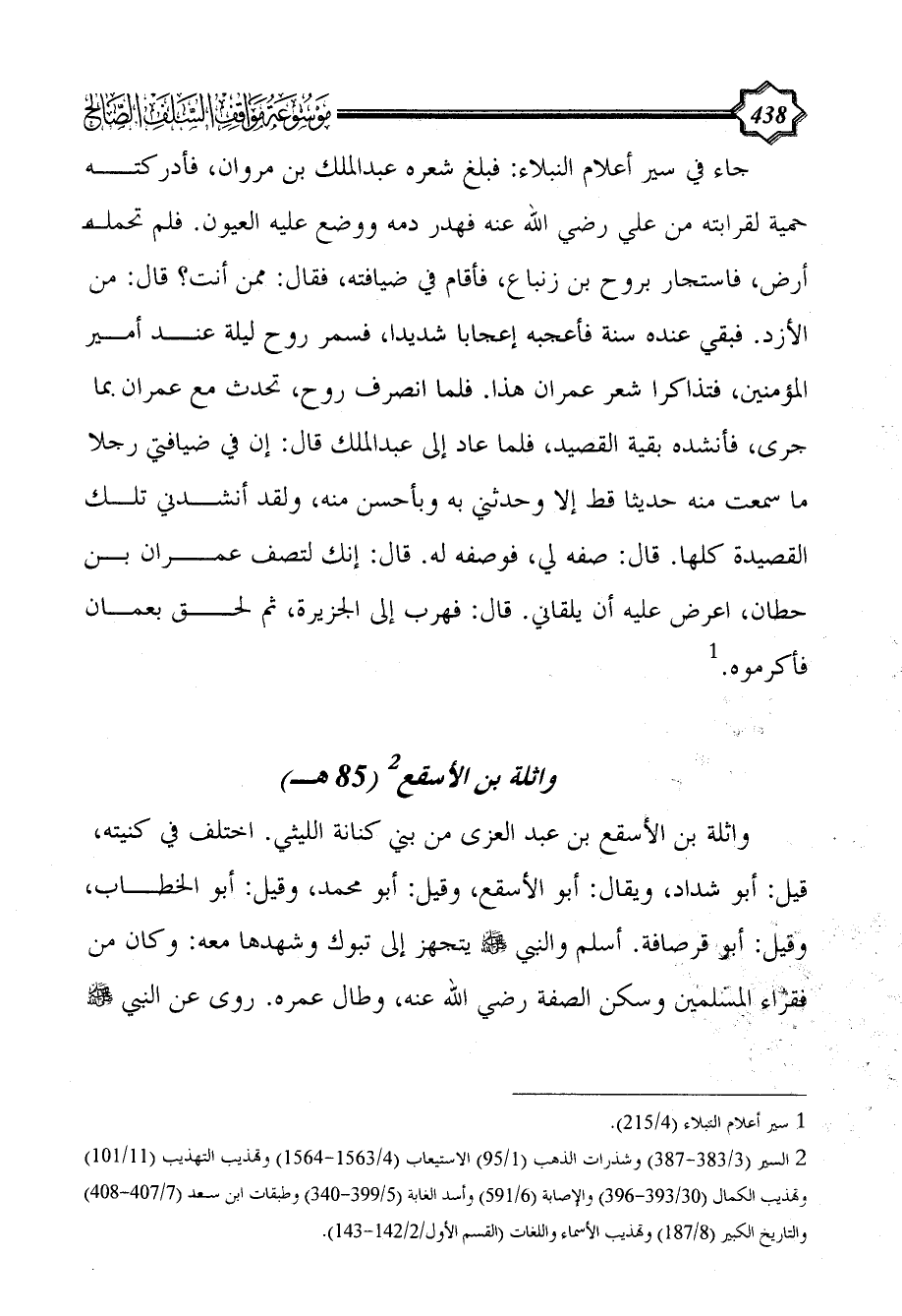 واثِلَة بن الأَسْقَع بن عبد العُزَّى من بني كِنَانَة اللَّيْثِي. اختلف في كنيته، قيل: أبو شداد، ويقال: أبو الأسقع، وقيل: أبو محمد، وقيل: أبو الخطاب، وقيل: أبو قرصافة. أسلم والنبي - صلى الله عليه وسلم - يتجهز إلى تبوك وشهدها معه: وكان من فقراء المسلمين وسكن الصفة رضي الله عنه، وطال عمره. روى عن النبي - صلى الله عليه وسلم -