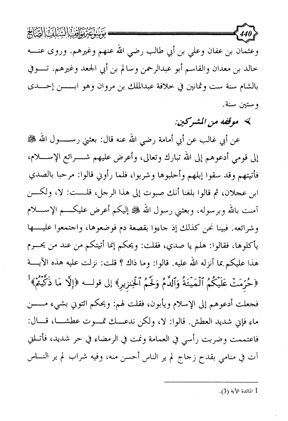عن أبي غالب عن أبي أمامة رضي الله عنه قال: بعثني رسول الله - صلى الله عليه وسلم - إلى قومي أدعوهم إلى الله تبارك وتعالى، وأعرض عليهم شرائع الإسلام، فأتيتهم وقد سقوا إبلهم وأحلبوها وشربوا، فلما رأوني قالوا: مرحبا بالصدي ابن عجلان، ثم قالوا بلغنا أنك صبوت إلى هذا الرجل، قلت: لا، ولكن آمنت بالله وبرسوله، وبعثني رسول الله - صلى الله عليه وسلم - إليكم أعرض عليكم الإسلام وشرائعه. فبينا نحن كذلك إذ جاءوا بقصعة دم فوضعوها، واجتمعوا عليها يأكلوها، فقالوا: هلم يا صدي، فقلت: ويحكم إنما أتيتكم من عند من يحرم هذا عليكم بما أنزله الله عليه. قالوا: وما ذاك؟ قلت: نزلت عليه هذه الآية {حُرِّمَتْ عليكم الميتة وَالدَّمُ وَلَحْمُ الخنزير} إلى قوله {إِلًّا مَا ذكيتم} (¬1) فجعلت أدعوهم إلى الإسلام ويأبون، فقلت لهم: ويحكم ائتوني بشيء من ماء فإني شديد العطش. قالوا: لا، ولكن ندعك تموت عطشا، قال: فاعتممت وضربت رأسي في العمامة ونمت في الرمضاء في حر شديد، فأتاني آت في منامي بقدح زجاج لم ير الناس أحسن منه، وفيه شراب لم ير الناس