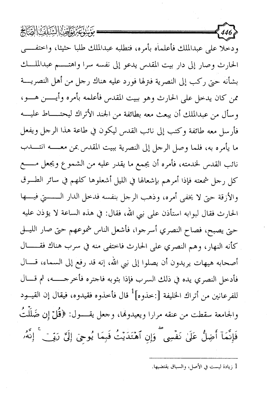 ودخلا على عبد الملك فأعلماه بأمره، فتطلبه عبد الملك طلبا حثيثا، واختفى الحارث وصار إلى دار بيت المقدس يدعو إلى نفسه سرا واهتم عبد الملك بشأنه حتى ركب إلى النصرية فنزلها فورد عليه هناك رجل من أهل النصرية ممن كان يدخل على الحارث وهو ببيت المقدس فأعلمه بأمره وأين هو، وسأل مِن عبد الملك أن يبعث معه بطائفة من الجند الأتراك ليحتاط عليه فأرسل معه طائفة وكتب إلى نائب القدس ليكون في طاعة هذا الرجل ويفعل ما يأمره به، فلما وصل الرجل إلى النصرية ببيت المقدس بمن معه انتدب نائب القدس لخدمته، فأمره أن يجمع ما يقدر عليه من الشموع ويجعل مع كل رجل شمعته فإذا أمرهم بإشعالها في الليل أشعلوها كلهم في سائر الطرق والأزقة حتى لا يخفى أمره، وذهب الرجل بنفسه فدخل الدار التي فيها الحارث فقال لبوابه استأذن على نبي الله، فقال: في هذه الساعة لا يؤذن عليه حتى يصبح، فصاح النصري أسرجوا، فأشعل الناس شموعهم حتى صار الليل كأنه النهار، وهم النصري على الحارث فاختفى منه في سرب هناك فقال أصحابه هيهات يريدون أن يصلوا إلى نبي الله، إنه قد رفع إلى السماء، قال فأدخل النصري يده في ذلك السرب فإذا بثوبه فاجتره فأخرجه، ثم قال للفرعانين من أتراك الخليفة [:خذوه] (¬1) قال فأخذوه فقيدوه، فيقال إن القيود والجامعة سقطت من عنقه مرارا ويعيدونها، وجعل يقول: {قُلْ إِنْ ضَلَلْتُ فَإِنَّمَا أَضِلُّ عَلَى نَفْسِي وَإِنِ اهْتَدَيْتُ فَبِمَا يُوحِي إِلَيَّ رَبِّي إِنَّهُ