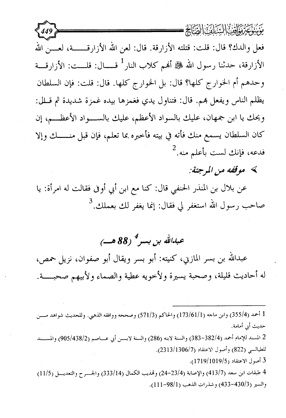 فعل والدك؟ قال: قلت: قتلته الأزارقة. قال: لعن الله الأزارقة، لعن الله الأزارقة، حدثنا رسول الله - صلى الله عليه وسلم - أنهم كلاب النار (¬1) قال: قلت: الأزارقة وحدهم أم الخوارج كلها؟ قال: بل الخوارج كلها. قال: قلت: فإن السلطان يظلم الناس ويفعل بهم. قال: فتناول يدي فغمزها بيده غمزة شديدة ثم قال: ويحك يا ابن جمهان، عليك بالسواد الأعظم، عليك بالسواد الأعظم، إن كان السلطان يسمع منك فأته في بيته فأخبره بما تعلم، فإن قبل منك وإلا فدعه، فإنك لست بأعلم منه. (¬2)