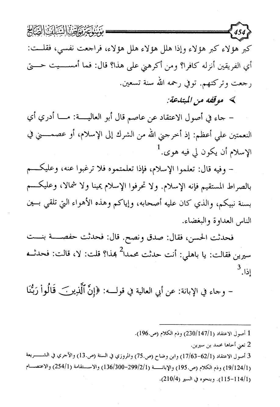 (¬3) أصول الاعتقاد (1/ 62 - 63/ 17) وابن وضاح (ص.75) والمروزي في السنة (ص.13) والآجري في الشريعة (1/ 124/19) وذم الكلام (ص.195) والإبانة (1/ 2/299 - 300/ 136) والاستقامة (1/ 254) والاعتصام (1/ 114 - 115). وبنحوه في السير (4/ 210).