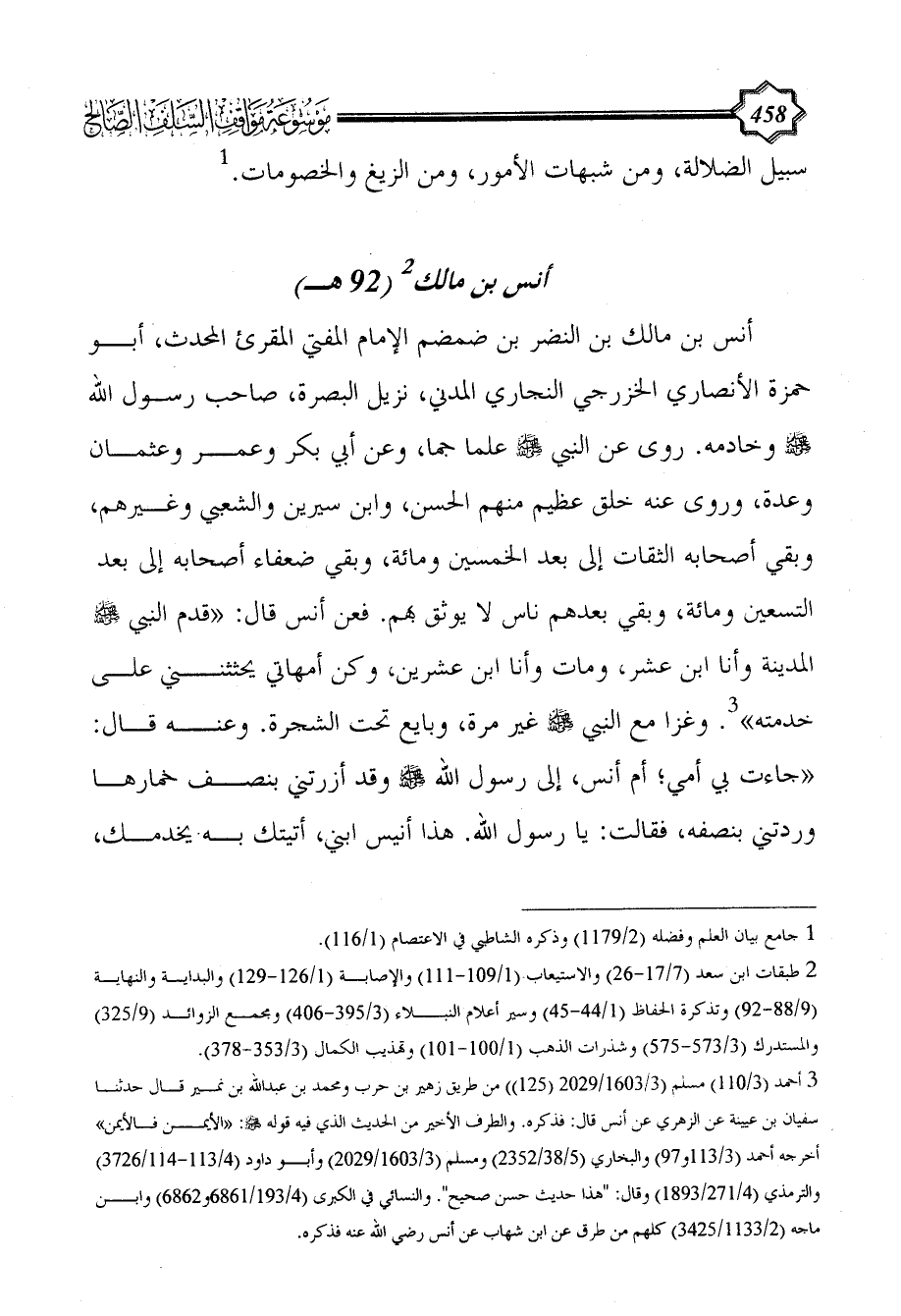 أنس بن مالك بن النَّضْر بن ضَمْضَم الإمام المفتي المقرئ المحدث، أبو حمزة الأنصاري الخزرجي النجاري المدني، نزيل البصرة، صاحب رسول الله - صلى الله عليه وسلم - وخادمه. روى عن النبي - صلى الله عليه وسلم - علما جما، وعن أبي بكر وعمر وعثمان وعدة، وروى عنه خلق عظيم منهم الحسن، وابن سيرين والشعبي وغيرهم، وبقي أصحابه الثقات إلى بعد الخمسين ومائة، وبقي ضعفاء أصحابه إلى بعد التسعين ومائة، وبقي بعدهم ناس لا يوثق بهم. فعن أنس قال: "قدم النبي - صلى الله عليه وسلم - المدينة وأنا ابن عشر، ومات وأنا ابن عشرين، وكن أمهاتي يحثثنني على خدمته" (¬3). وغزا مع النبي - صلى الله عليه وسلم - غير مرة، وبايع تحت الشجرة. وعنه قال: "جاءت بي أمي؛ أم أنس، إلى رسول الله - صلى الله عليه وسلم - وقد أزرتني بنصف خمارها وردتني بنصفه، فقالت: يا رسول الله. هذا أنيس ابني، أتيتك به يخدمك،