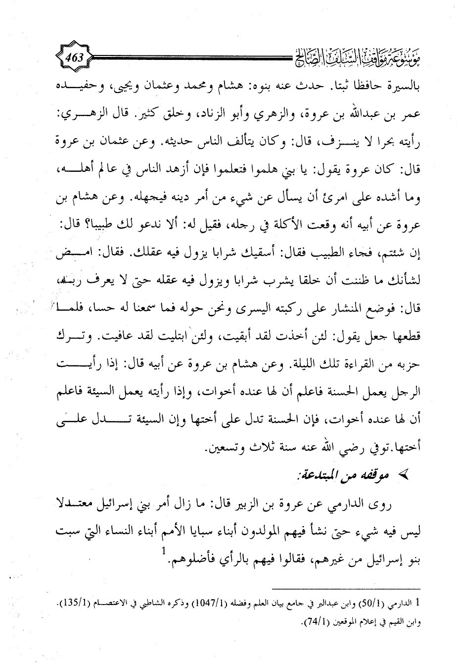 بالسيرة حافظا ثبتا. حدث عنه بنوه: هشام ومحمد وعثمان ويحيى، وحفيده عمر بن عبد الله بن عروة، والزهري وأبو الزناد، وخلق كثير. قال الزهري: رأيته بحرا لا ينزف، قال: وكان يتألف الناس حديثه. وعن عثمان بن عروة قال: كان عروة يقول: يا بني هلموا فتعلموا فإن أزهد الناس في عالم أهله، وما أشده على امرئ أن يسأل عن شيء من أمر دينه فيجهله. وعن هشام بن عروة عن أبيه أنه وقعت الأكلة في رجله، فقيل له: ألا ندعو لك طبيبا؟ قال: إن شئتم، فجاء الطبيب فقال: أسقيك شرابا يزول فيه عقلك. فقال: امض لشأنك ما ظننت أن خلقا يشرب شرابا ويزول فيه عقله حتى لا يعرف ربه، قال: فوضع المنشار على ركبته اليسرى ونحن حوله فما سمعنا له حسا، فلما قطعها جعل يقول: لئن أخذت لقد أبقيت، ولئن ابتليت لقد عافيت. وترك حزبه من القراءة تلك الليلة. وعن هشام بن عروة عن أبيه قال: إذا رأيت الرجل يعمل الحسنة فاعلم أن لها عنده أخوات، وإذا رأيته يعمل السيئة فاعلم أن لها عنده أخوات، فإن الحسنة تدل على أختها وإن السيئة تدل على أختها. توفي رضي الله عنه سنة ثلاث وتسعين.
