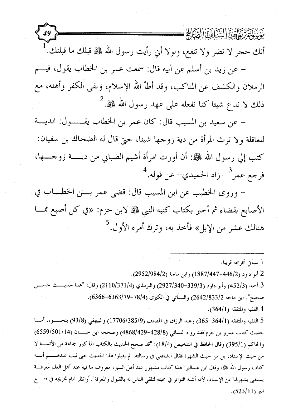 (¬5) الفقيه والمتفقه (1/ 364 - 365) وعبد الرزاق في المصنف (9/ 385/17706) والبيهقي (8/ 93) بنحوه. أما حديث كتاب عمرو بن حزم فقد رواه النسائي (8/ 428 - 429/ 4868) وصححه ابن حبان (14/ 501/6559) والحاكم (1/ 395) وقال الحافظ في التلخيص (4/ 18): "قد صحح الحديث بالكتاب المذكور جماعة من الأئمة لا من حيث الإسناد، بل من حيث الشهرة فقال الشافعي في رسالته: لم يقبلوا هذا الحديث حتى ثبت عندهم أنه كتاب رسول الله - صلى الله عليه وسلم -، وقال ابن عبد البر: هذا كتاب مشهور عند أهل السير، معروف ما فيه عند أهل العلم معرفة يستغنى بشهرتها عن الإسناد، لأنه أشبه التواتر في مجيئه لتلقي الناس له بالقبول والمعرفة". وانظر تمام تخريجه في فتح البر (11/ 523).