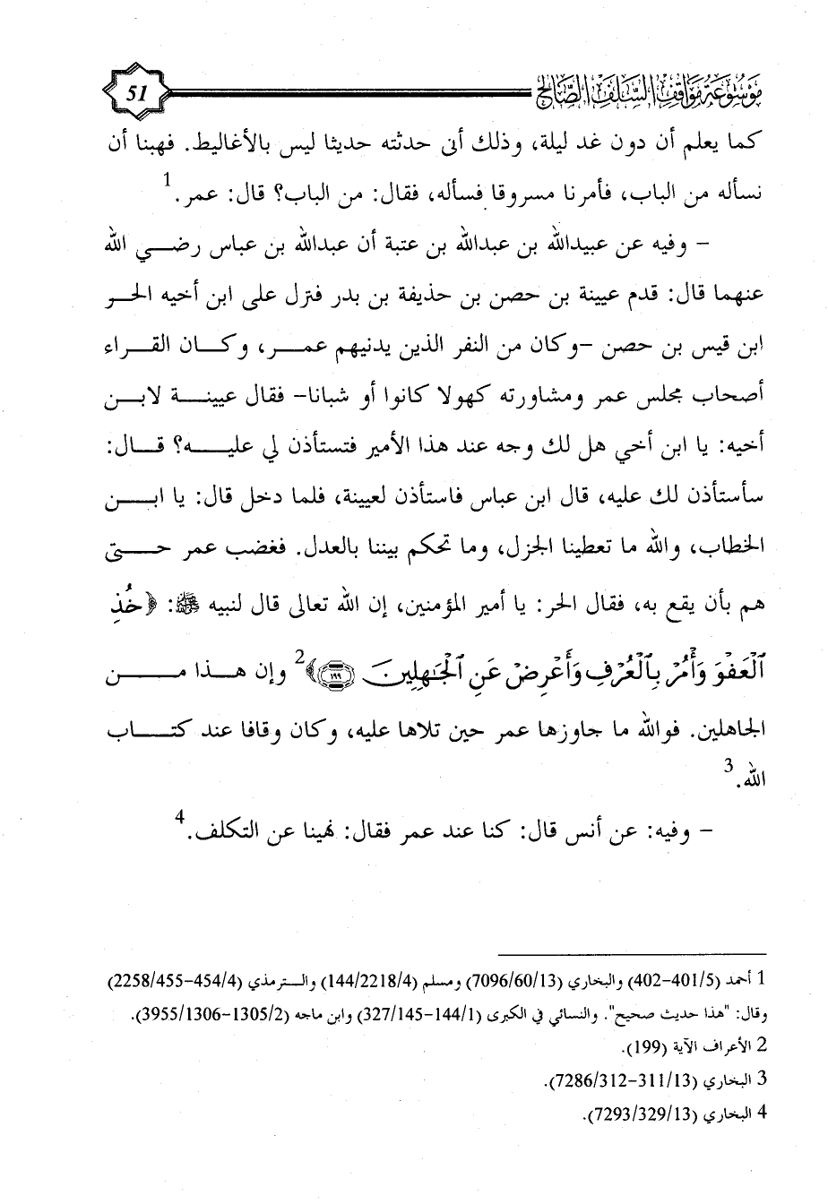 - وفيه عن عبيد الله بن عبد الله بن عتبة أن عبد الله بن عباس رضي الله عنهما قال: قدم عيينة بن حصن بن حذيفة بن بدر فنزل على ابن أخيه الحر ابن قيس بن حصن -وكان من النفر الذين يدنيهم عمر، وكان القراء أصحاب مجلس عمر ومشاورته كهولا كانوا أو شبانا- فقال عيينة لابن أخيه: يا ابن أخي هل لك وجه عند هذا الأمير فتستأذن لي عليه؟ قال: سأستأذن لك عليه، قال ابن عباس فاستأذن لعيينة، فلما دخل قال: يا ابن الخطاب، والله ما تعطينا الجزل، وما تحكم بيننا بالعدل. فغضب عمر حتى هم بأن يقع به، فقال الحر: يا أمير المؤمنين، إن الله تعالى قال لنبيه - صلى الله عليه وسلم -: {خُذِ الْعَفْوَ وَأْمُرْ بِالْعُرْفِ وَأَعْرِضْ عَنِ الْجَاهِلِينَ} (¬2) وإن هذا من الجاهلين. فوالله ما جاوزها عمر حين تلاها عليه، وكان وقافا عند كتاب الله. (¬3)