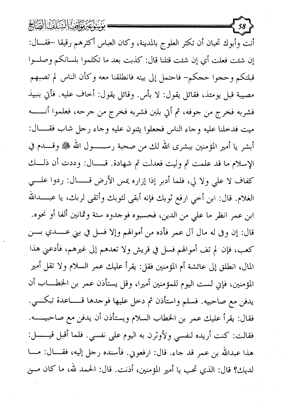أنت وأبوك تحبان أن تكثر العلوج بالمدينة، وكان العباس أكثرهم رقيقا -فقال: إن شئت فعلت أي إن شئت قتلنا قال: كذبت بعد ما تكلموا بلسانكم وصلوا قبلتكم وحجوا حجكم- فاحتمل إلى بيته فانطلقنا معه وكأن الناس لم تصبهم مصيبة قبل يومئذ، فقائل يقول: لا بأس. وقائل يقول: أخاف عليه. فأتي بنبيذ فشربه فخرج من جوفه، ثم أتي بلبن فشربه فخرج من جرحه، فعلموا أنه ميت فدخلنا عليه وجاء الناس فجعلوا يثنون عليه وجاء رجل شاب فقال: أبشر يا أمير المؤمنين ببشرى الله لك من صحبة رسول الله - صلى الله عليه وسلم - وقدم في الإسلام ما قد علمت ثم وليت فعدلت ثم شهادة. قال: وددت أن ذلك كفاف لا علي ولا لي، فلما أدبر إذا إزاره يمس الأرض قال: ردوا علي الغلام. قال: ابن أخي ارفع ثوبك فإنه أبقى لثوبك وأتقى لربك، يا عبد الله ابن عمر انظر ما علي من الدين، فحسبوه فوجدوه ستة وثمانين ألفا أو نحوه. قال: إن وفى له مال آل عمر فأده من أموالهم وإلا فسل في بني عدي بن كعب، فإن لم تف أموالهم فسل في قريش ولا تعدهم إلى غيرهم، فأدعني هذا المال، انطلق إلى عائشة أم المؤمنين فقل: يقرأ عليك عمر السلام ولا تقل أمير المؤمنين، فإني لست اليوم للمؤمنين أميرا، وقل يستأذن عمر بن الخطاب أن يدفن مع صاحبيه. فسلم واستأذن ثم دخل عليها فوجدها قاعدة تبكي. فقال: يقرأ عليك عمر بن الخطاب السلام ويستأذن أن يدفن مع صاحبيه. فقالت: كنت أريده لنفسي ولأوثرن به اليوم على نفسي.