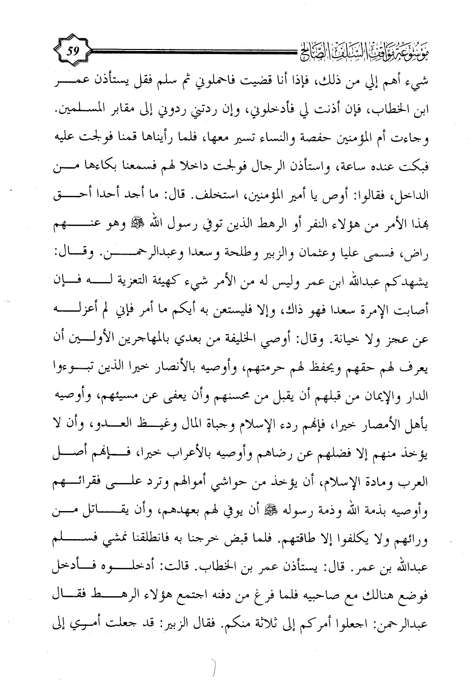 شيء أهم إلي من ذلك، فإذا أنا قضيت فاحملوني ثم سلم فقل يستأذن عمر ابن الخطاب، فإن أذنت لي فأدخلوني، وإن ردتني ردوني إلى مقابر المسلمين. وجاءت أم المؤمنين حفصة والنساء تسير معها، فلما رأيناها قمنا فولجت عليه فبكت عنده ساعة، واستأذن الرجال فولجت داخلا لهم فسمعنا بكاءها من الداخل، فقالوا: أوص يا أمير المؤمنين، استخلف. قال: ما أجد أحدا أحق بهذا الأمر من هؤلاء النفر أو الرهط الذين توفي رسول الله - صلى الله عليه وسلم - وهو عنهم راض، فسمى عليا وعثمان والزبير وطلحة وسعدا وعبد الرحمن. وقال: يشهدكم عبد الله ابن عمر وليس له من الأمر شيء كهيئة التعزية له فإن أصابت الإمرة سعدا فهو ذاك، وإلا فليستعن به أيكم ما أمر فإني لم أعزله عن عجز ولا خيانة. وقال: أوصي الخليفة من بعدي بالمهاجرين الأولين أن يعرف لهم حقهم ويحفظ لهم حرمتهم، وأوصيه بالأنصار خيرا الذين تبوءوا الدار والإيمان من قبلهم أن يقبل من محسنهم وأن يعفى عن مسيئهم، وأوصيه بأهل الأمصار خيرا، فإنهم ردء الإسلام وجباة المال وغيظ العدو، وأن لا يؤخذ منهم إلا فضلهم عن رضاهم وأوصيه بالأعراب خيرا، فإنهم أصل العرب ومادة الإسلام، أن يؤخذ من حواشي أموالهم وترد على فقرائهم وأوصيه بذمة الله وذمة رسوله - صلى الله عليه وسلم - أن يوفي لهم بعهدهم، وأن يقاتل من ورائهم ولا يكلفوا إلا طاقتهم. فلما قبض خرجنا به فانطلقنا نمشي فسلم عبد الله بن عمر. قال: يستأذن عمر بن الخطاب. قالت: أدخلوه فأدخل فوضع هنالك مع صاحبيه فلما فرغ من دفنه اجتمع هؤلاء الرهط فقال عبد الرحمن: اجعلوا أمركم إلى ثلاثة منكم. فقال الزبير: قد جعلت أمري إلى